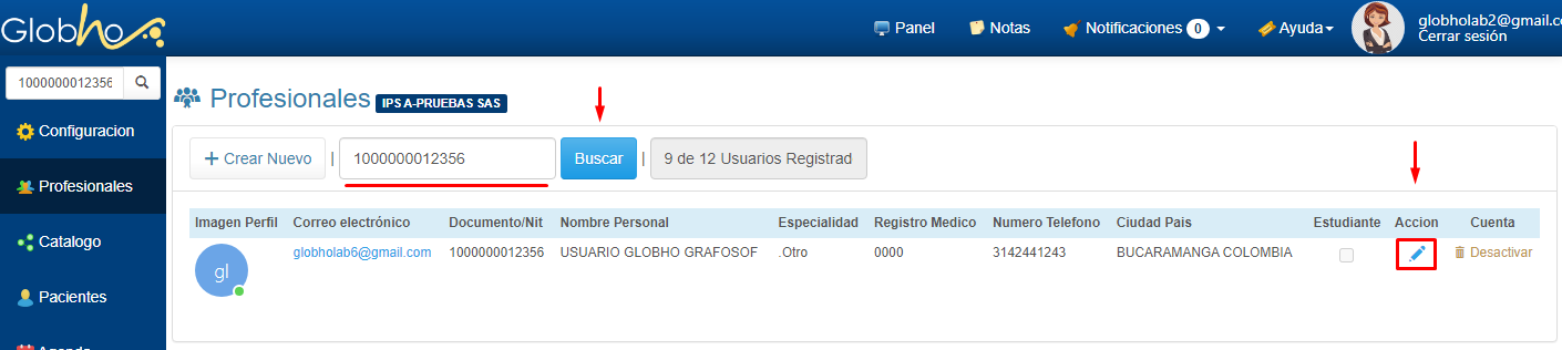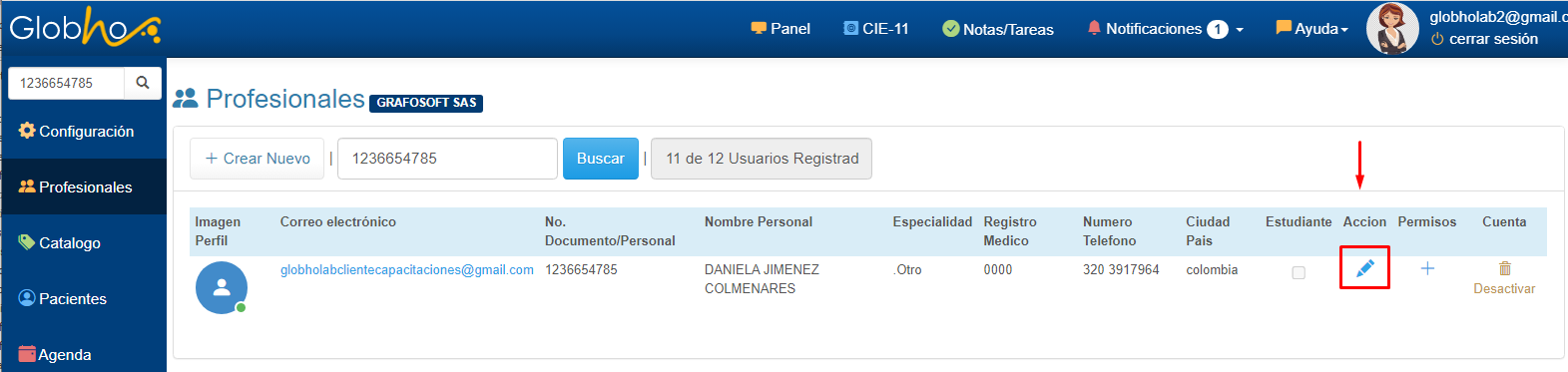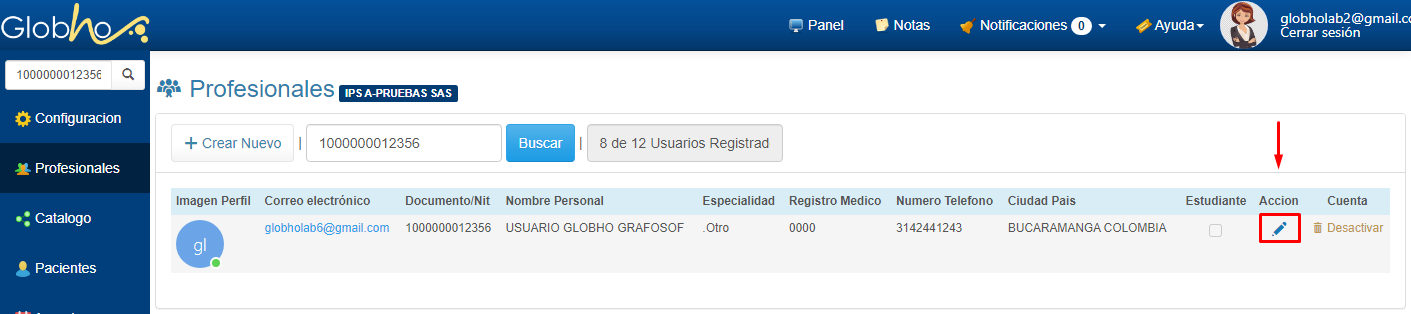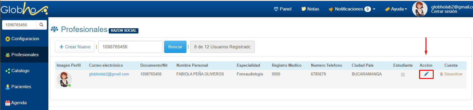 2. Sobre la línea del Profesional haz clic en el botón Editar ubicado en la columna Acción