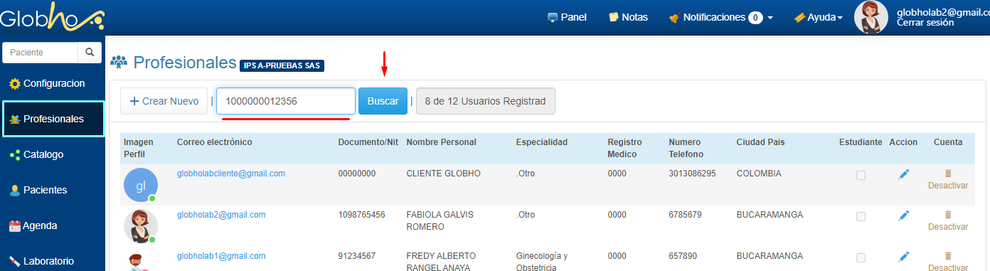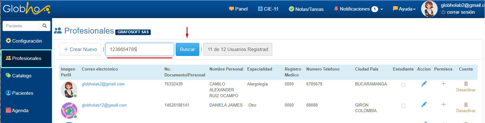 1. Ingresa a Profesionales en el Menú Principal, ingresa el número de documento requerido y haz clic en el botón Buscar.