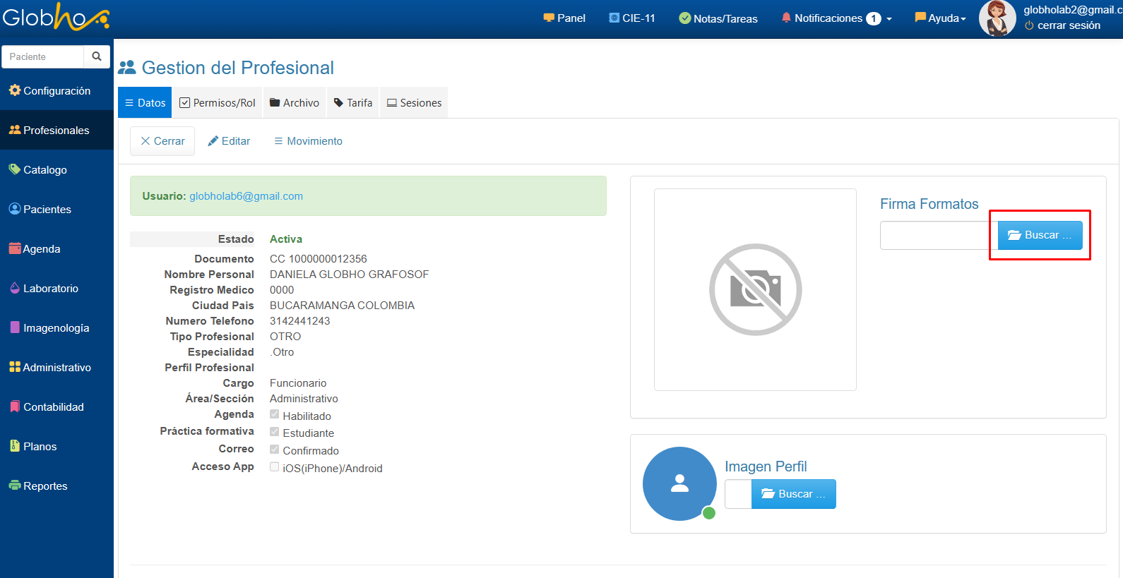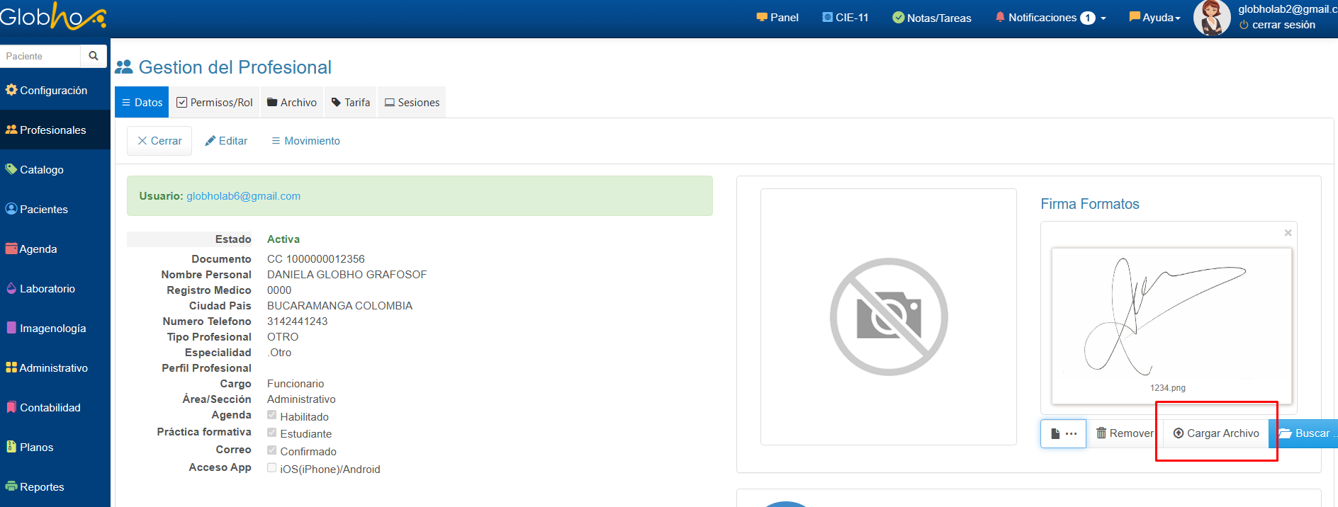 Para cargar la Firma digital, puedes hacer el mismo proceso de cargar Imagen del Profesional, haciendo clic en: