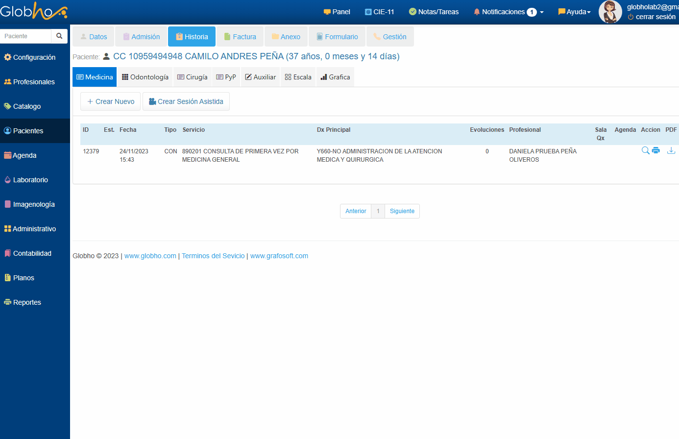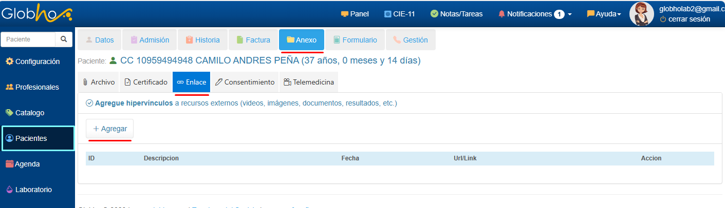 1. Selecciona Paciente. Ver aquí 2. Haz clic en Anexo, selecciona la pestaña Enlace y haz clic en el botón + Agregar.