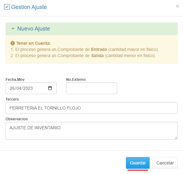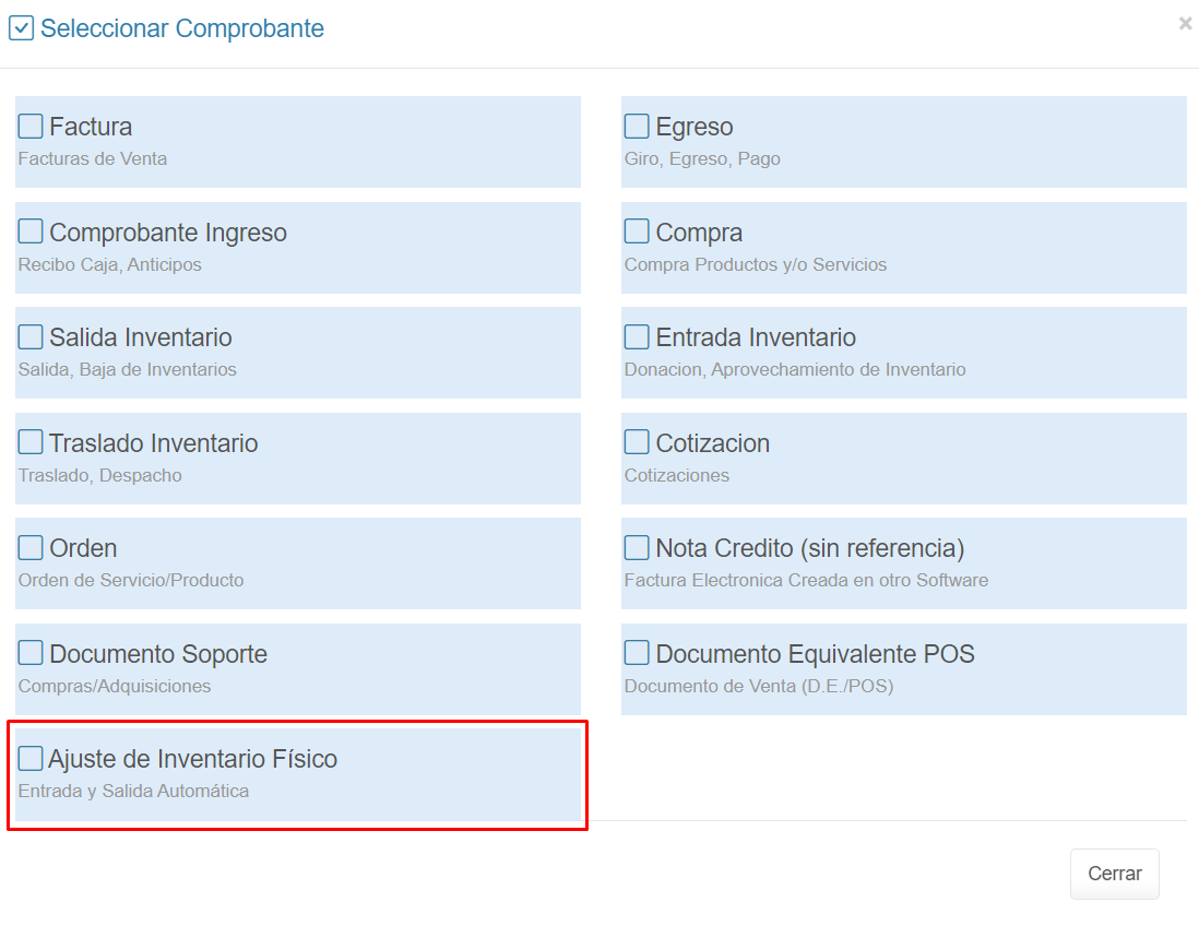2. Selecciona el comprobante Ajuste de Inventario.