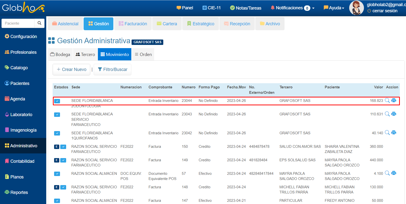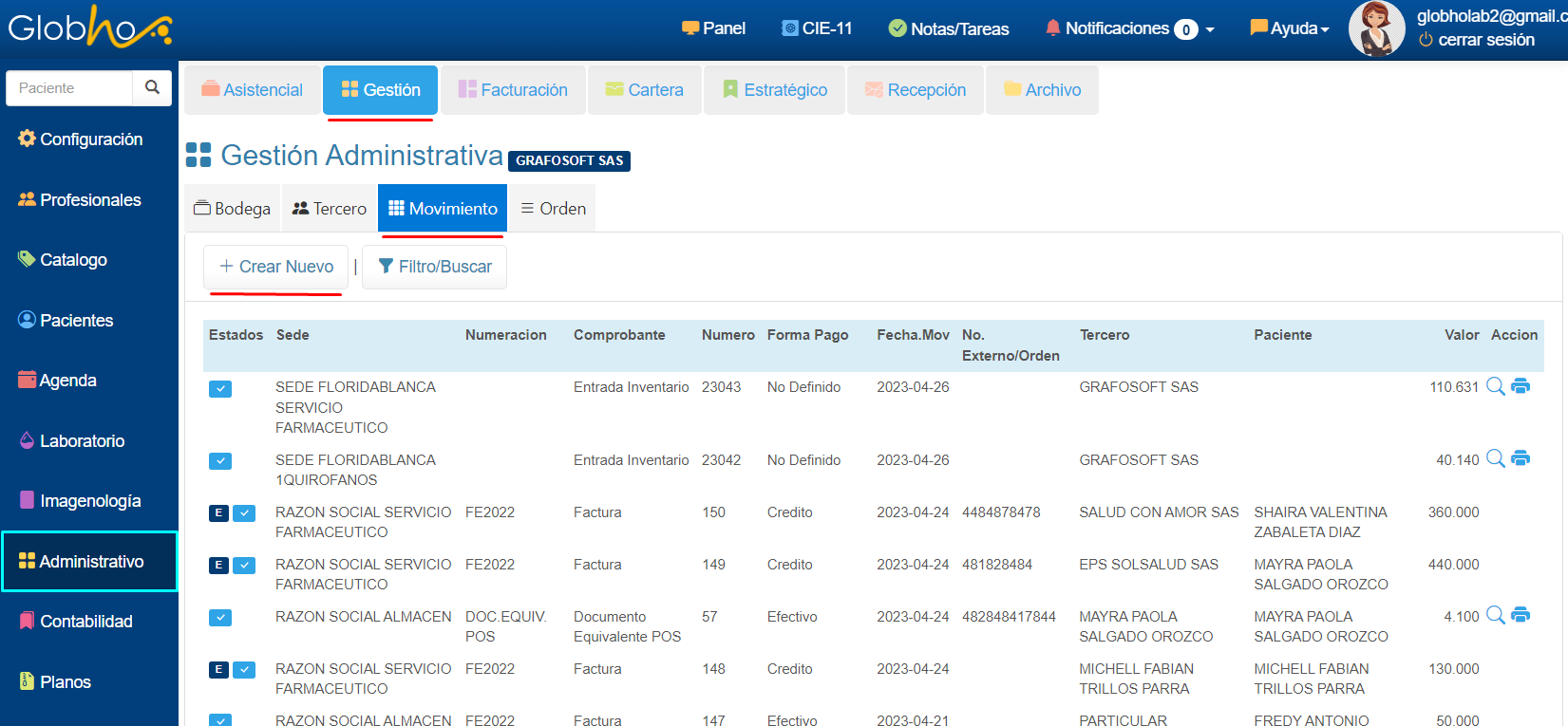 1. Realiza la ruta menú Administrativo/Gestión/Movimiento/Botón Crear Nuevo.