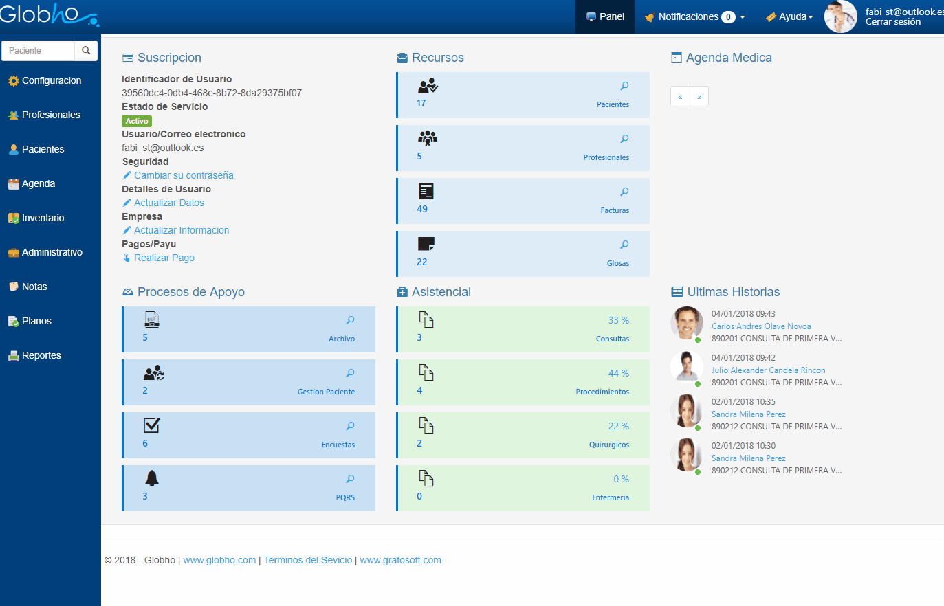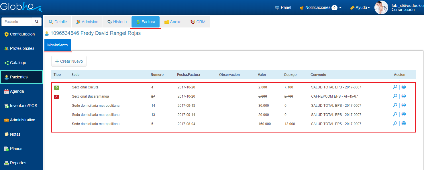 1. Ingresa a Pacientes en el Menú Principal. 2. Realiza la Búsqueda del Paciente al que pertenece la Factura que quieres Consultar. 3. Una vez en el Detalle del Perfil del Paciente, selecciona la opción Facturas para visualizar la facturación realizada al Paciente, haz clic en el icono de la lupa ubicado al final de cada registro de Factura para ingresar al Detalle.