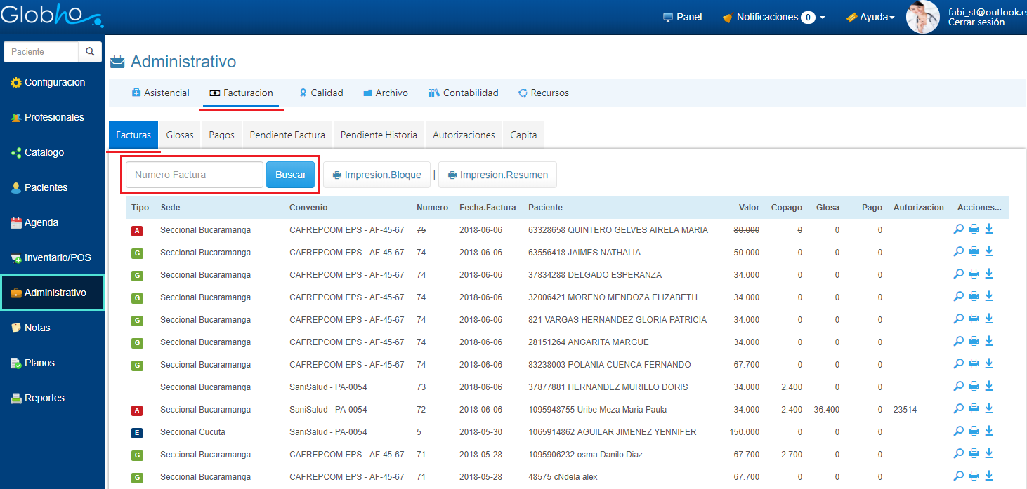 1. Ingresa a Administrativo en el Menú Principal. 2. En Facturación, en la seccion Facturas, digita el Número de la Factura que deseas visualizar y haz Clic o Enter para realizar el Filtro.