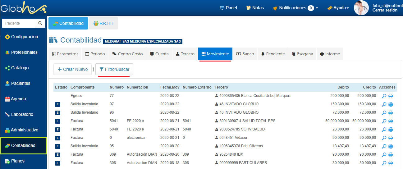 1. Haz clic en Menú Contabilidad y selecciona la pestaña Movimiento. 2. Haz clic en el botón Filtro/Buscar.
