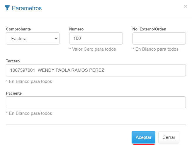 2. Ingresa Parametros según el comprobante que deseas filtrar y haz clic en el botón Aceptar.