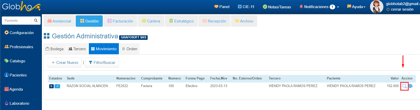 1. Ingresa a Administrativo en el Menú Principal, realiza la ruta Gestión - Movimiento, y haz clic en el botón Filtro/Buscar.