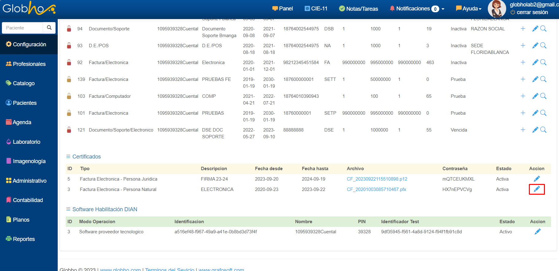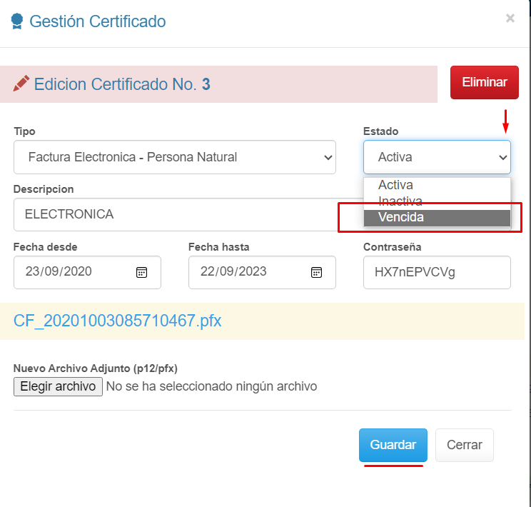 5. Finaliza verificando datos y desactivando el Certificado vencido haciendo clic en el botón en forma de Lápiz al final del registro.