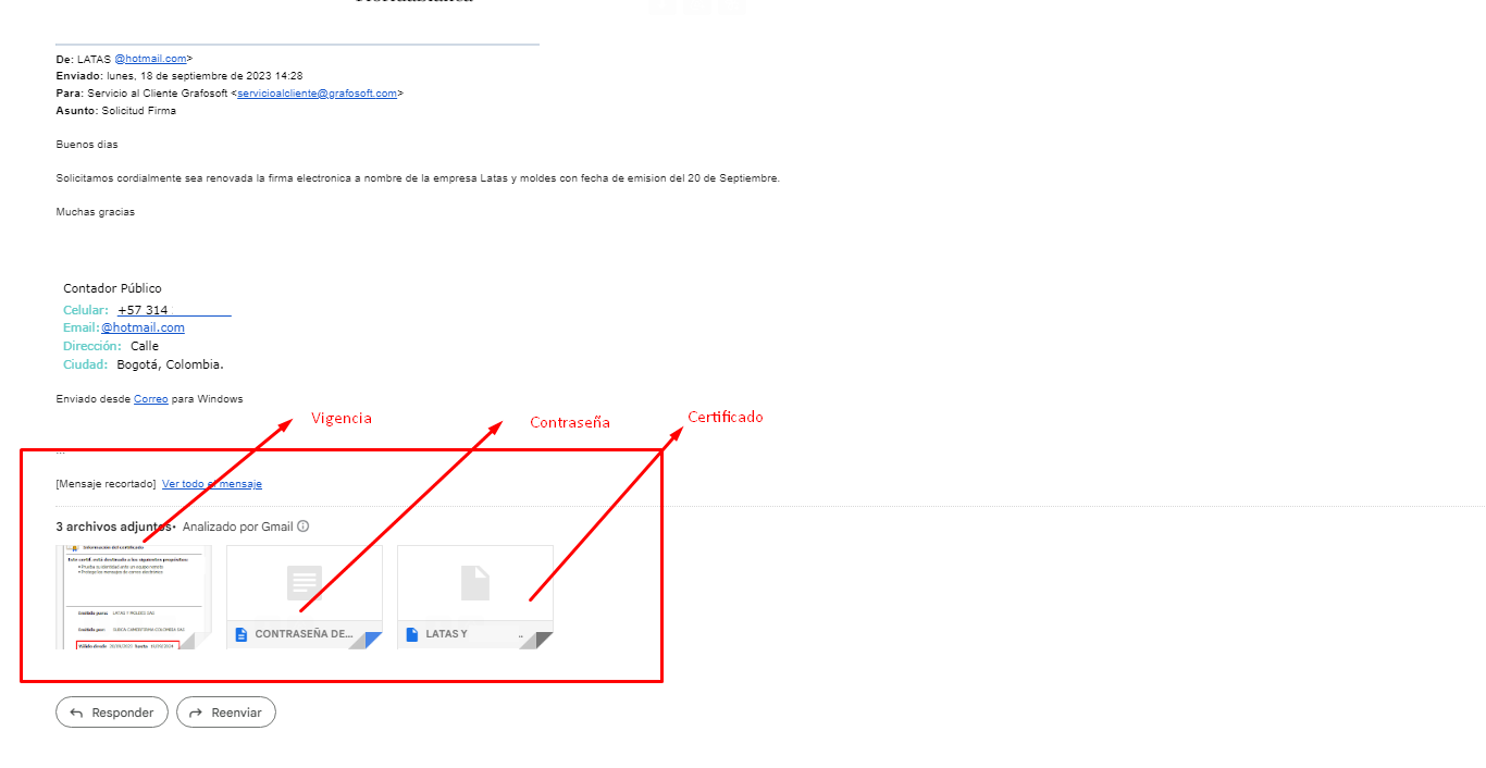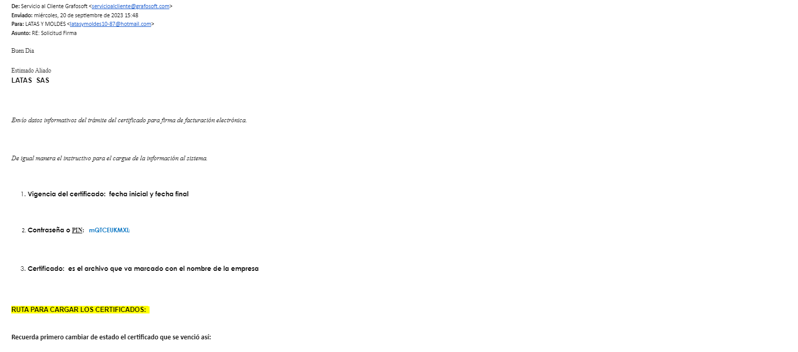 3. Al final del correo encontrarás tres archivos, Fechas de vigencia, contraseña y el certificado de firma digital listo para consultar, descargar y configurar.