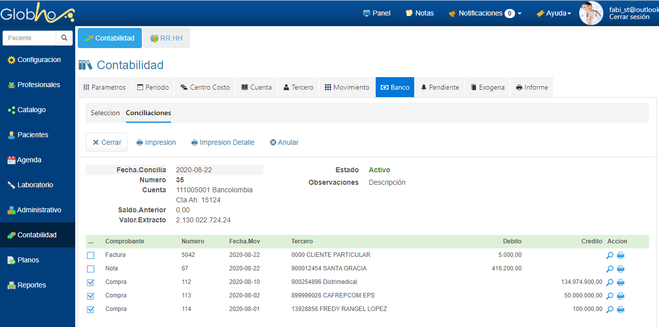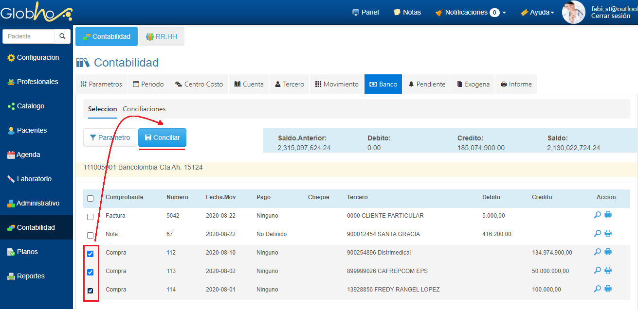 5. A continuación se visualiza los movimientos de la Cuenta seleccionada anteriormente, haz clic en la casilla de verificación de cada movimiento que desees conciliar contra el Extracto Bancario y posteriormente haz clic en el botón Conciliar.