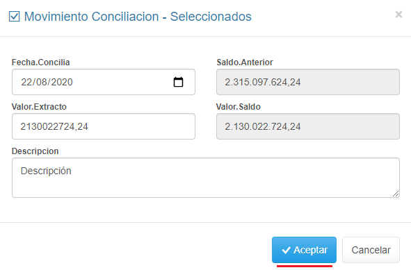 5. Ingresa el valor del Saldo de la Cuenta reflejado en el Extracto Bancario y haz clic en Aceptar.