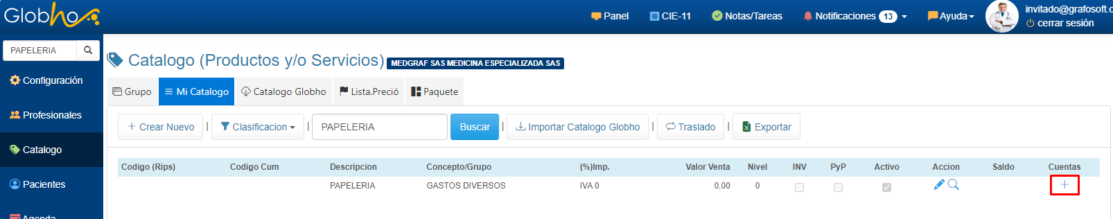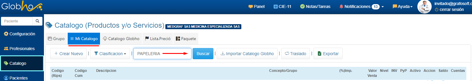 1. Ingresa a Catálogo en el Menú Principal. 2. Filtra el servicio que vas a configurar agregando código o descripción del mismo en la barra de búsqueda y haz clic en el botón Buscar.
