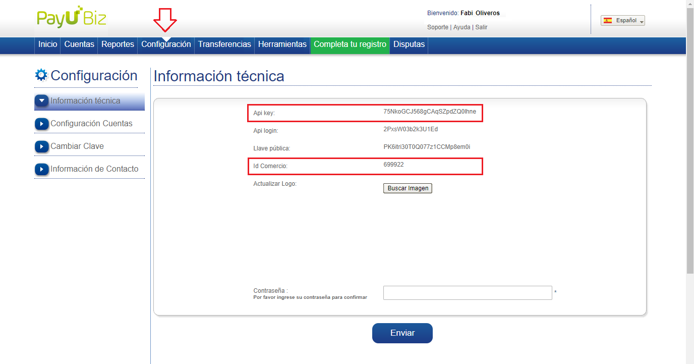 1. Ingresa a tu Cuenta Payu. 2. Haz clic en Configuración, donde encontraras el Api Key y el Id de Comercio.
