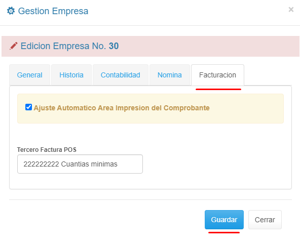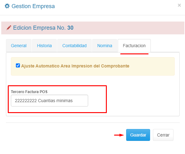 3. Haz clic en la pestaña Facturación y en el campo Tercero Factura POS agrega el tercero Cuantías Mínimas previamente creado.