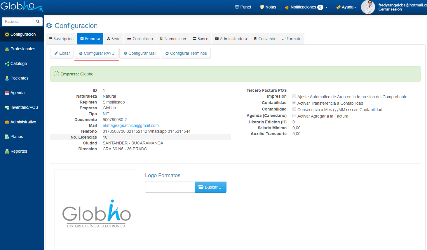 1. Selecciona Configuración en el Menú Principal. 2. En la seccion Sede haz clic la opción Configurar PAYU.