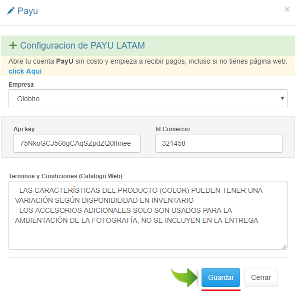 3. Realiza la consulta de Apy Kay e Id de Comercio como lo explicamos al inicio del proceso, copia estos datos y pegalos en los respectivos campos. 4. Haz clic en el botón Guardar.