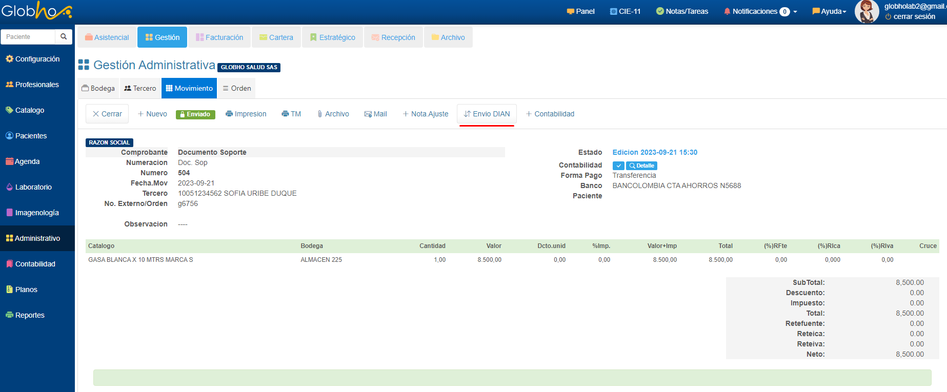 1. En el Detalle del Documento Soporte haz clic en el botón ENVIO DIAN