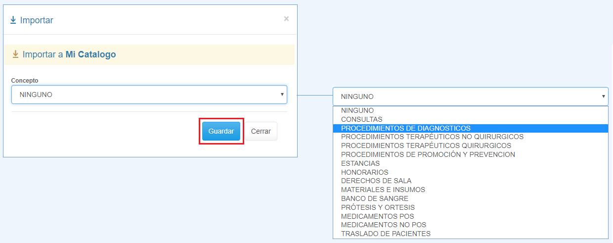 2. Selecciona el grupo que deseas descargar a tu Catálogo. Para finalizar haz clic en el botón Guardar.