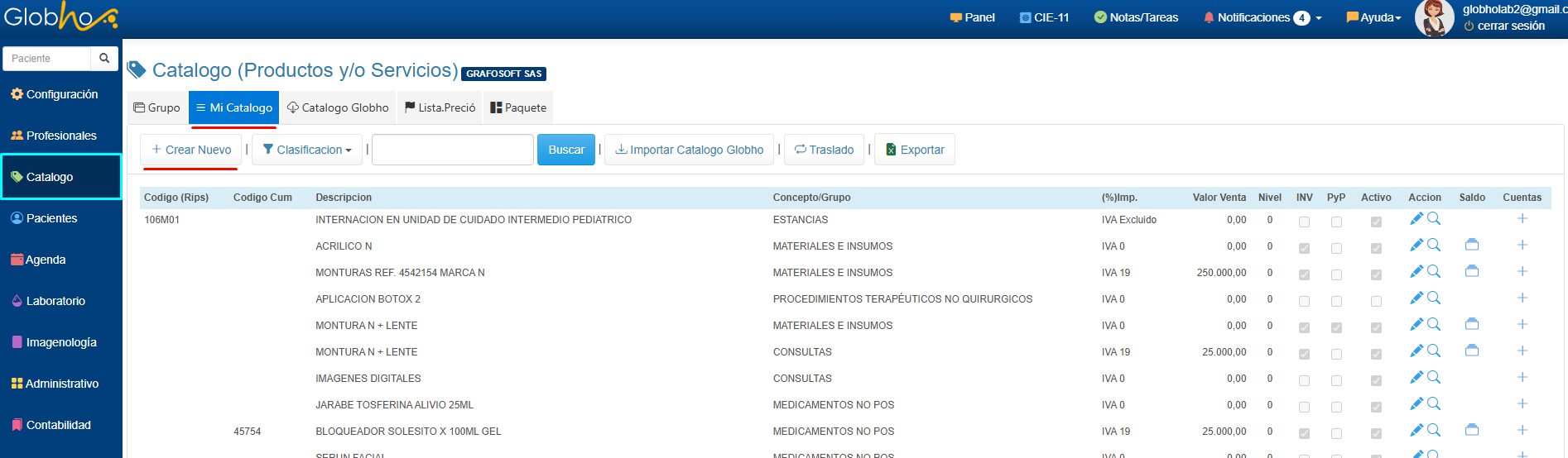 Esta funcionalidad para crear servicios únicamente aplica para servicios que no puedes importar desde el catálogo globho porque no están incluidos y por ende no es posible descargarlos. Ejemplo: medicamentos pos. Evita crear servcios dobles, estos únicamente podrán editarse más no, eliminar su registro. |