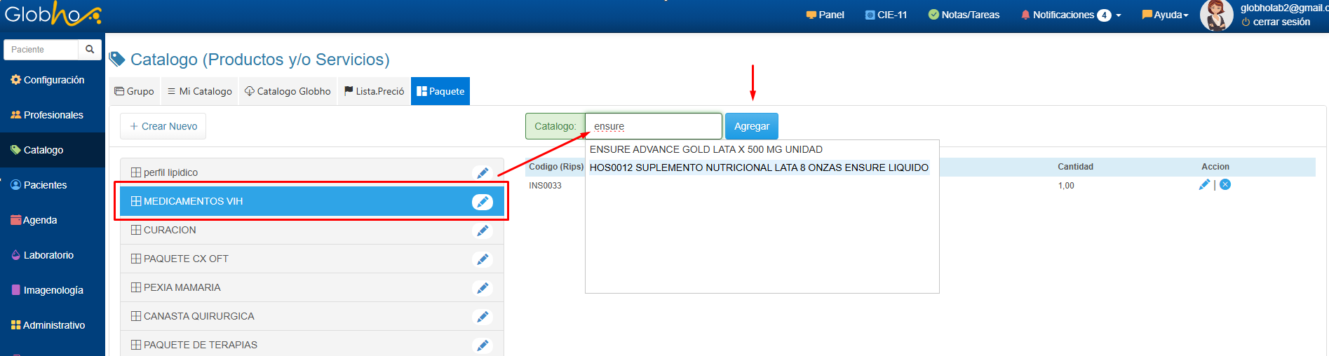1. Selecciona el Paquete. 2. El el campo de búsqueda selecciona el item del Catálogo, que vas a agregar. Haz clic en el botón Agregar.