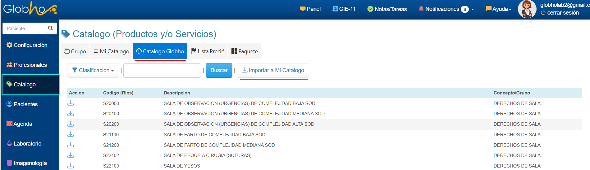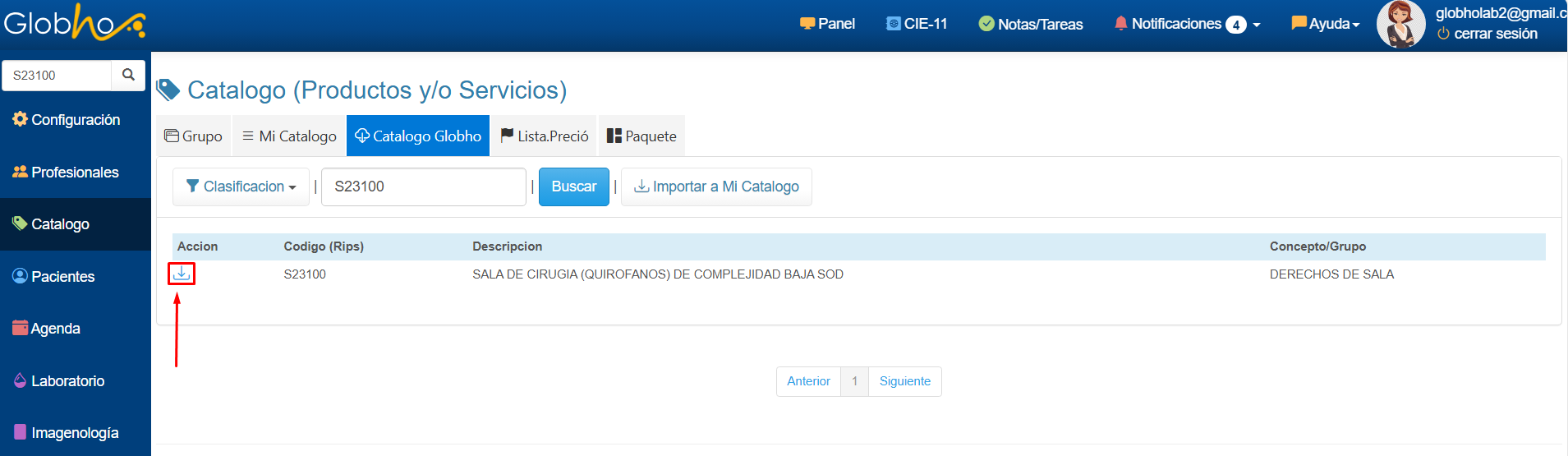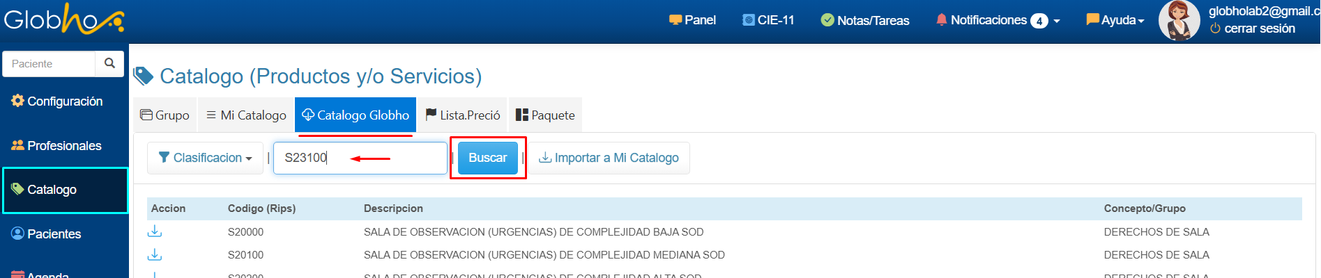 1. Realiza la ruta menú Catálogo/CatálogoGlobho y agrega el código o servicio que deseas buscar para la descarga, haz clic en el botón buscar.