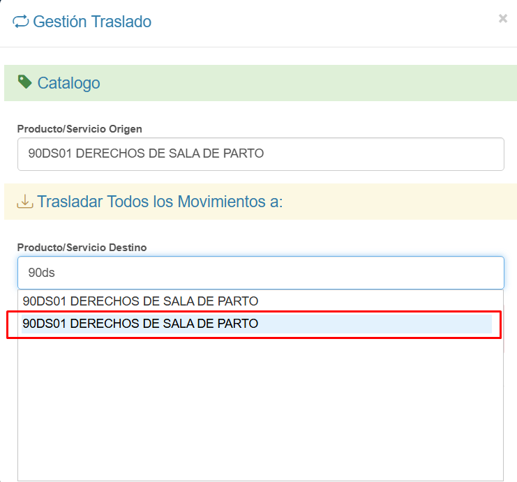 2. Agrega el Catálogo (producto/Servicio) en el campo de origen y selecciona la primer posición. En el campo Destino agrega el catálogo y selecciona la segunda posición.