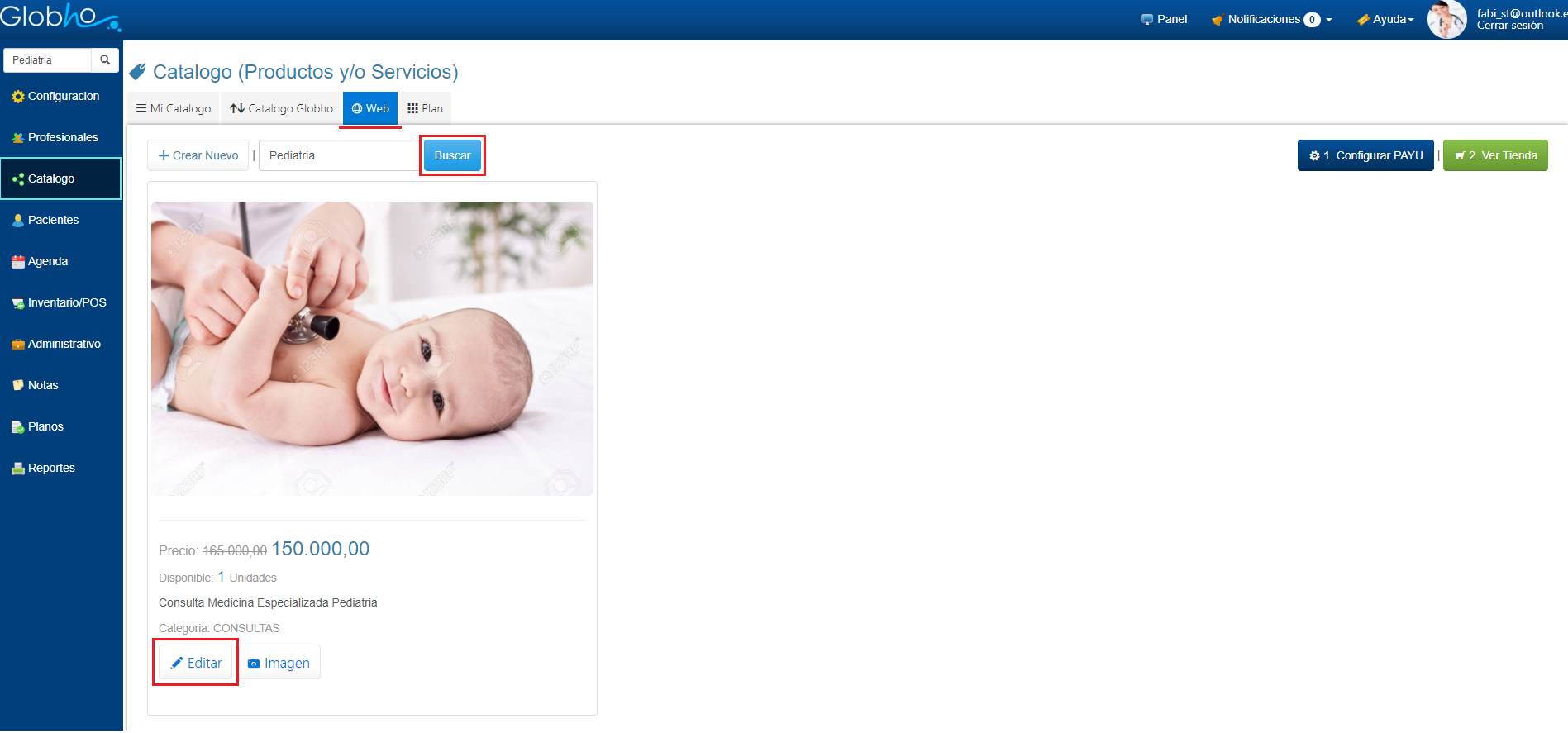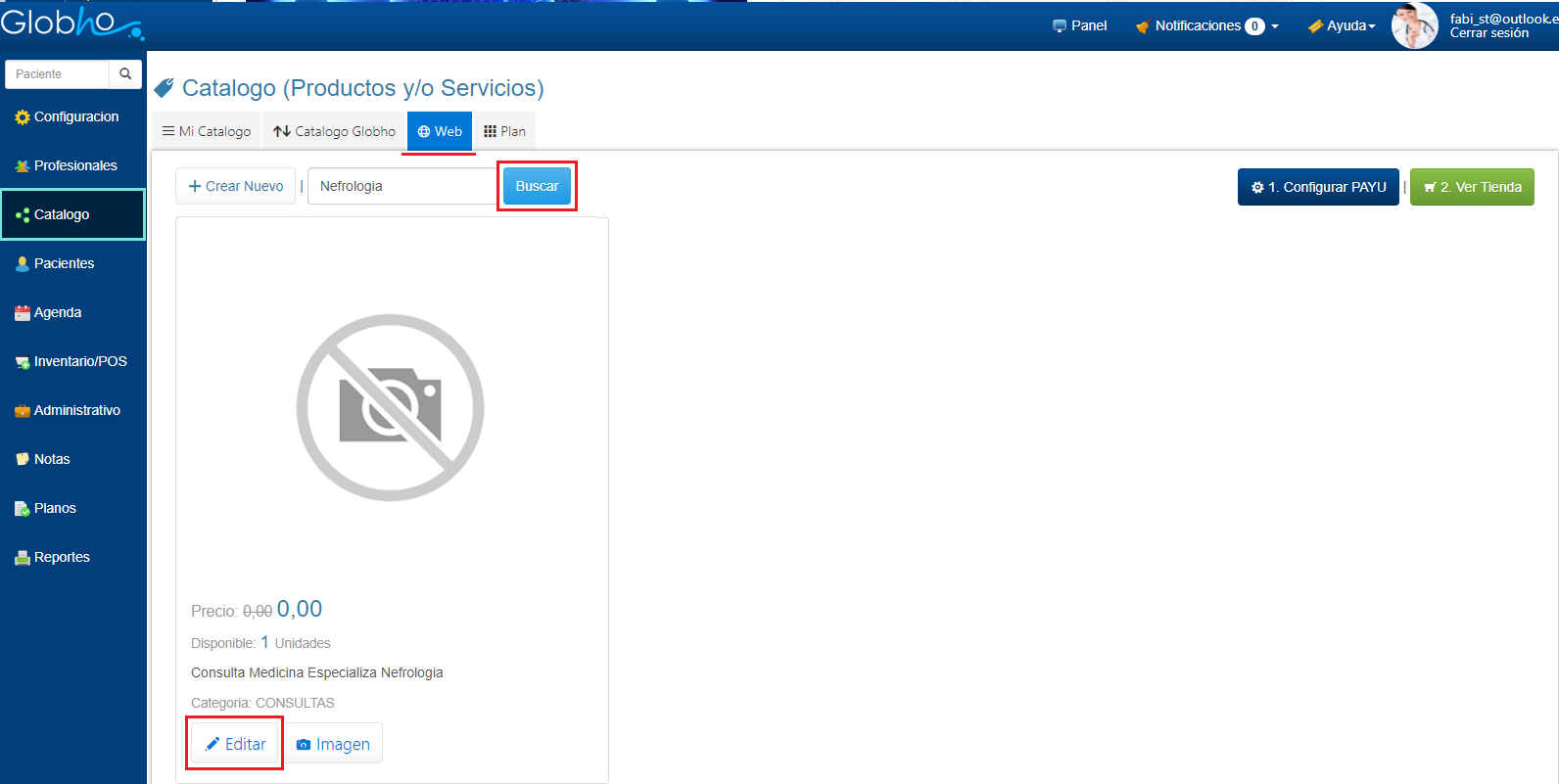 1. Ingresa a Catálogo en el Menú Principal. 2. Selecciona la pestaña Web. 3. En el campo de búsqueda, digita el Producto que quieres Publicar y haz clic en el botón Buscar. 4. Haz clic en el botón Editar.