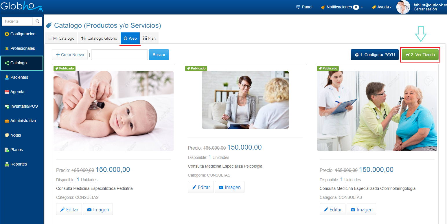 1. Ingresa a Catálogo en el Menú Principal. 2. Selecciona la pestaña Web. 3. Haz clic en el botón Ver Tienda.