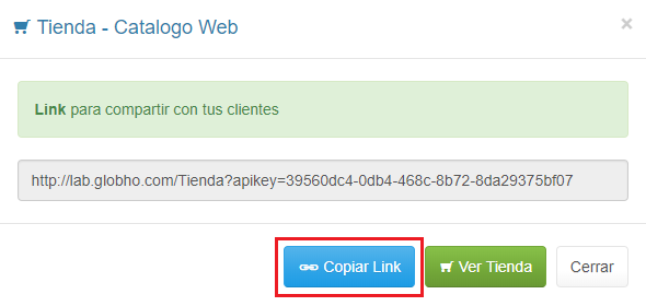 4. Copia el link de Tu Tienda haciendo clic en el botón Copiar Link y compartelo a tus clientes por el medio que quieras (correo Electrónico o Redes Sociales).