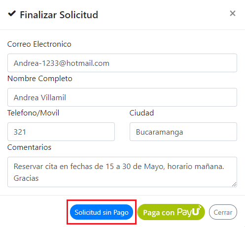 4. Diligencia los datos en el formulario y haz clic en el botón Solicitud sin Pago.