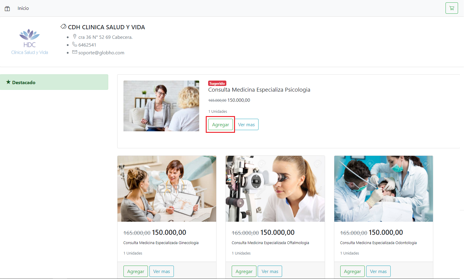 1. Ingresar a la Tienda Virtual de Globho, por medio del Link previamente compartido por el Administrador del Sistema. 2. Seleccionar el botón Agregar ubicado en el Producto de interés.