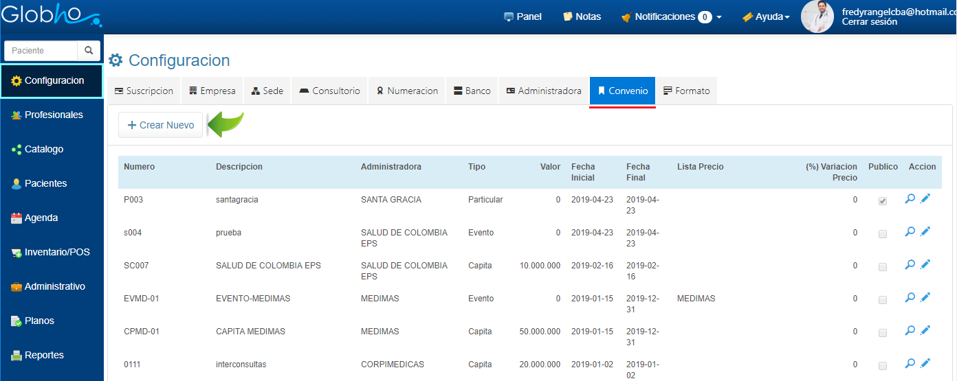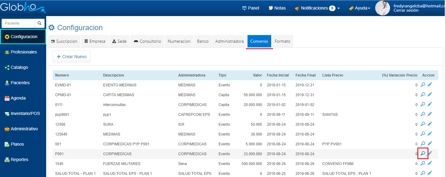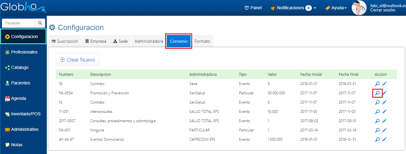 1. En Configuración selecciona la opción Convenio. 2. Haz clic en el icono en forma de Lupa al final de registro del Convenio, al cuál vas a asignar un Plan de Salud.