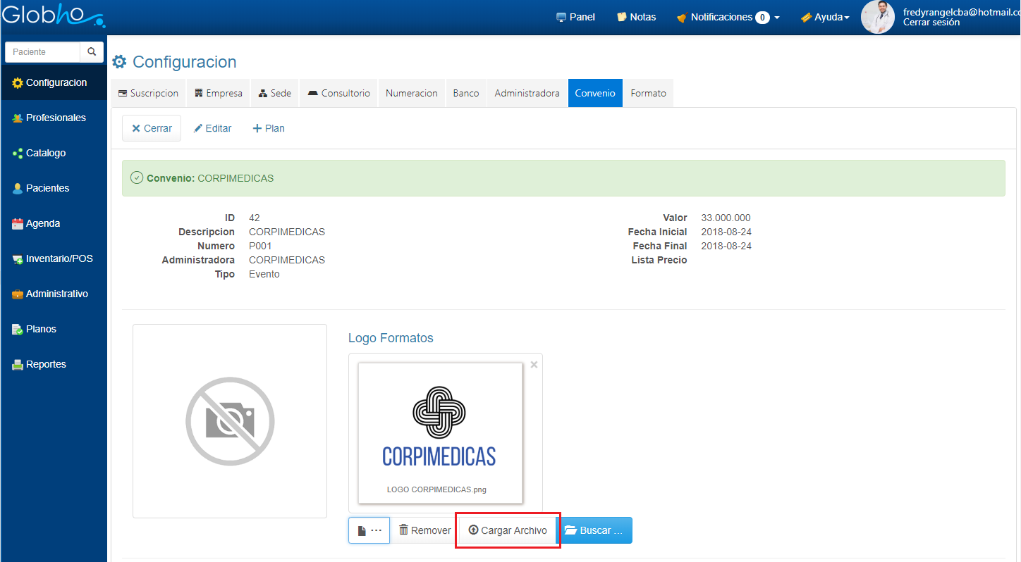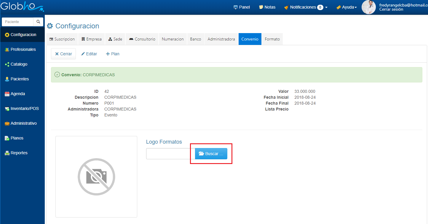 1. En Configuración selecciona la opción Convenio. 2. Haz clic en el icono en forma de Lupa al final de registro del Convenio, al cuál vas a asignar el Logo.