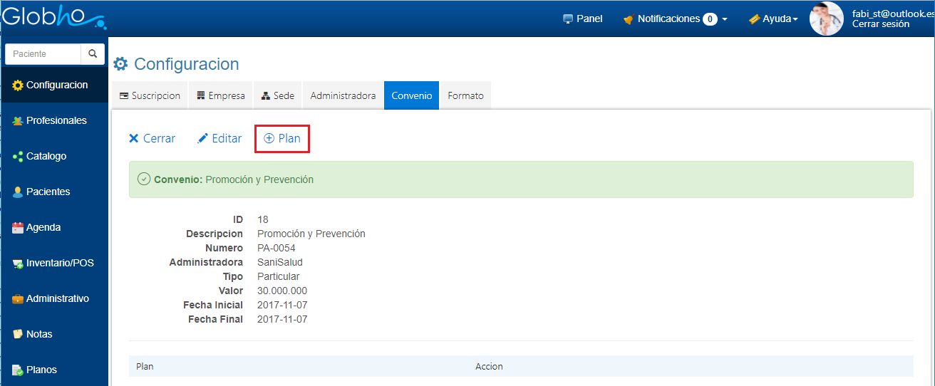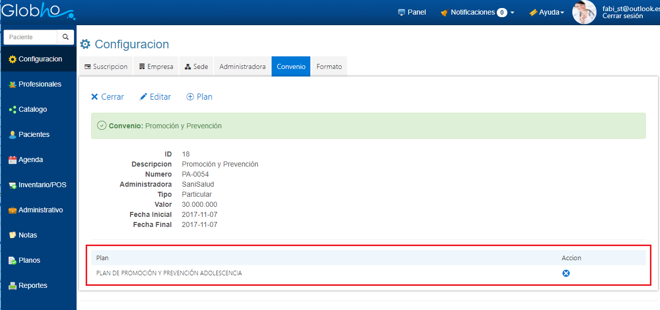 La asociación del Plan a el Convenio se visualiza en el Detalle del mismo de la siguiente manera:
