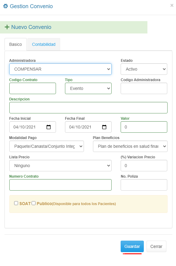 En el Campo Tipo, la opción Particular aplica para todos los pacientes sin importar la EPS, en caso de que algún Paciente desee tomar un servicio como Particular, estando afiliado a una EPS. La Casilla de verificación Publico: Disponible para todos los Pacientes, sólo se debe seleccionar en caso de que se requiera que el Convenio esté disponible para ser usado por todos los Pacientes. |