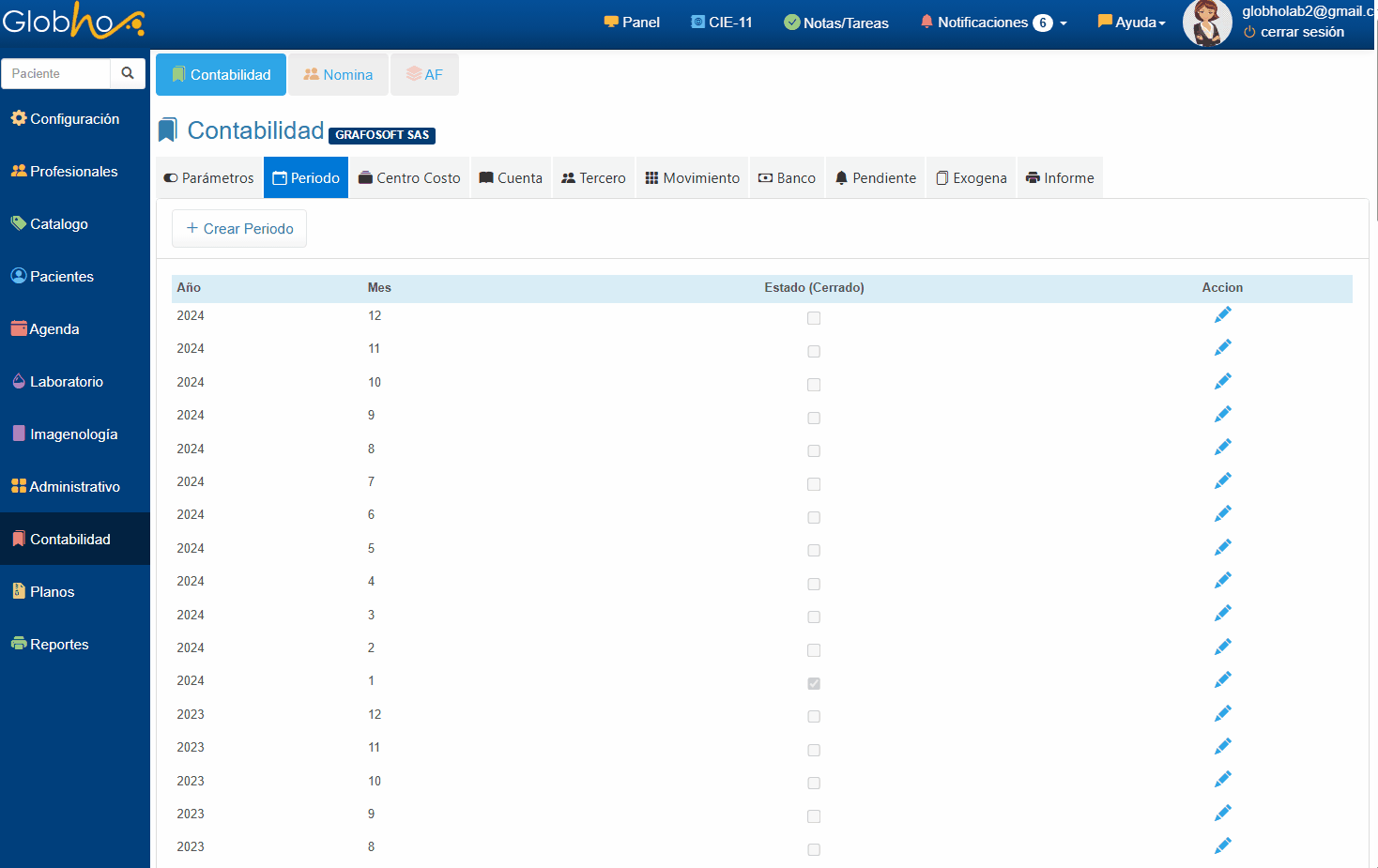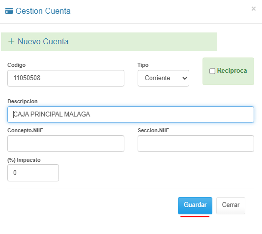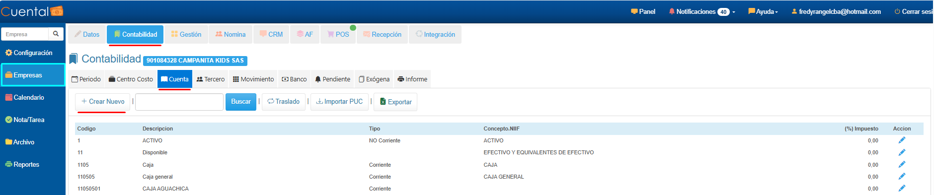 1. Haz clic en Menú Contabilidad. 2. Selecciona la pestaña Cuenta y haz clic en el botón Crear Nuevo.