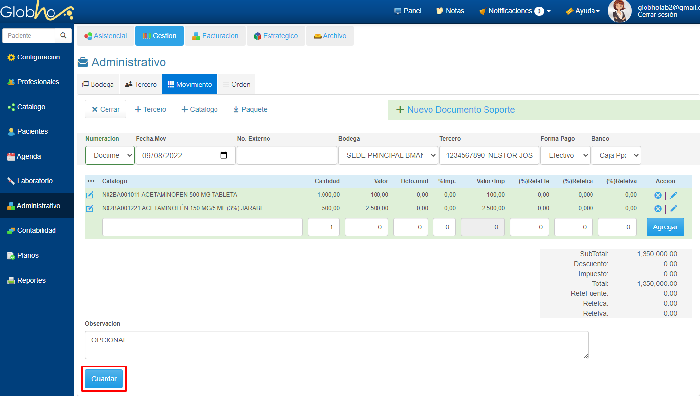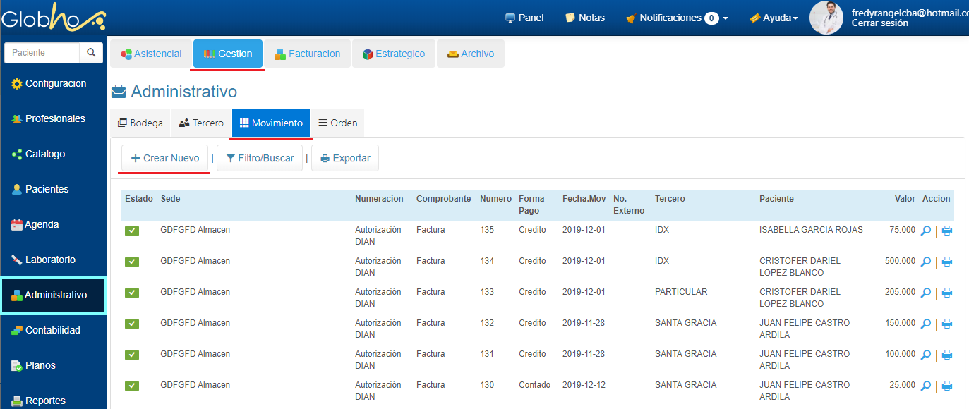 1. Ingresa a Administrativo en el Menú Principal. 2. En la ruta Gestión - Movimiento, haz clic en el botón Crear Nuevo.
