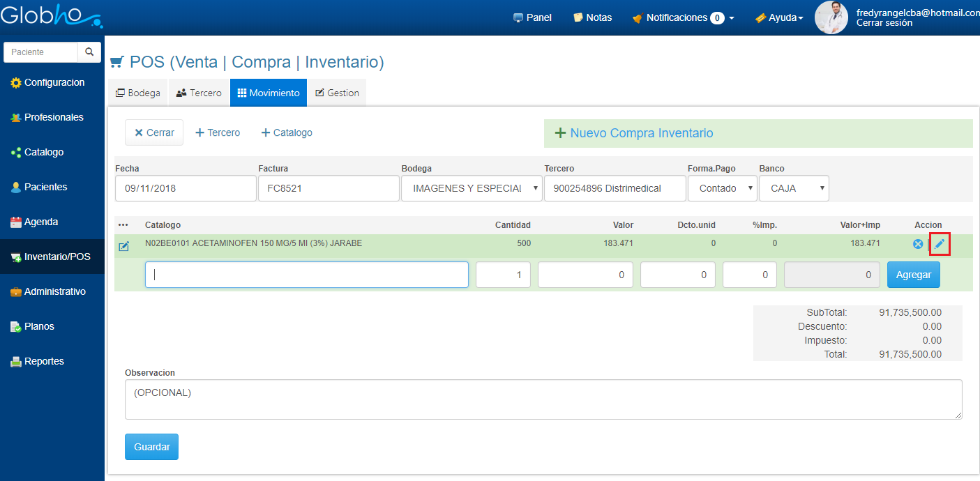 ✓ Para ingresar Datos como: DependenciaCódigo Cum, Reg. Sanitario, Lote, Fecha de vencimiento, Marca, Clasificación u observación por cada item, haz clic en el botón en forma de Lápiz al final del registro de cada línea.
