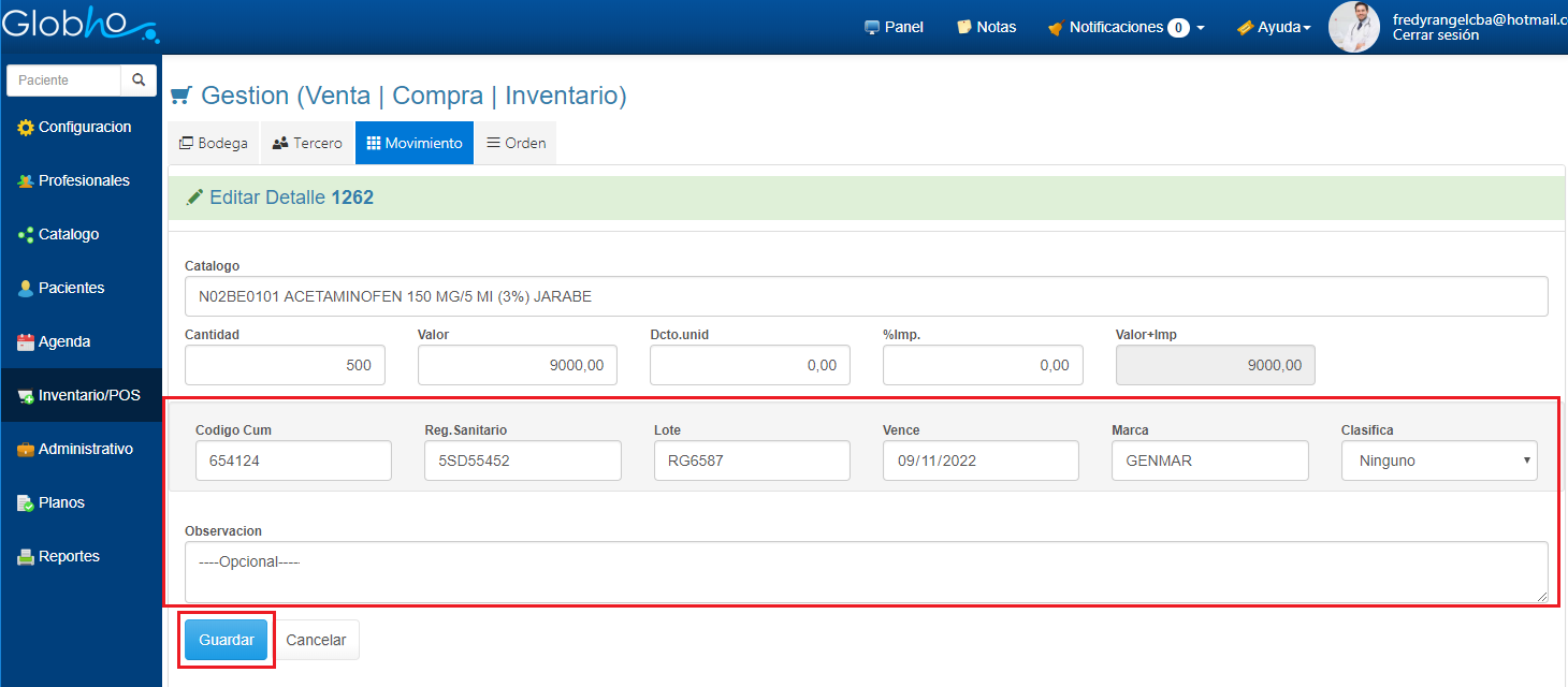 Sí requieres registrar Código Cum, Registro Sanitario, Lote, Fecha de Vencimiento, Marca, Clasificación de Riesgo y Comentarios o Notas en el campo de Observaciones.