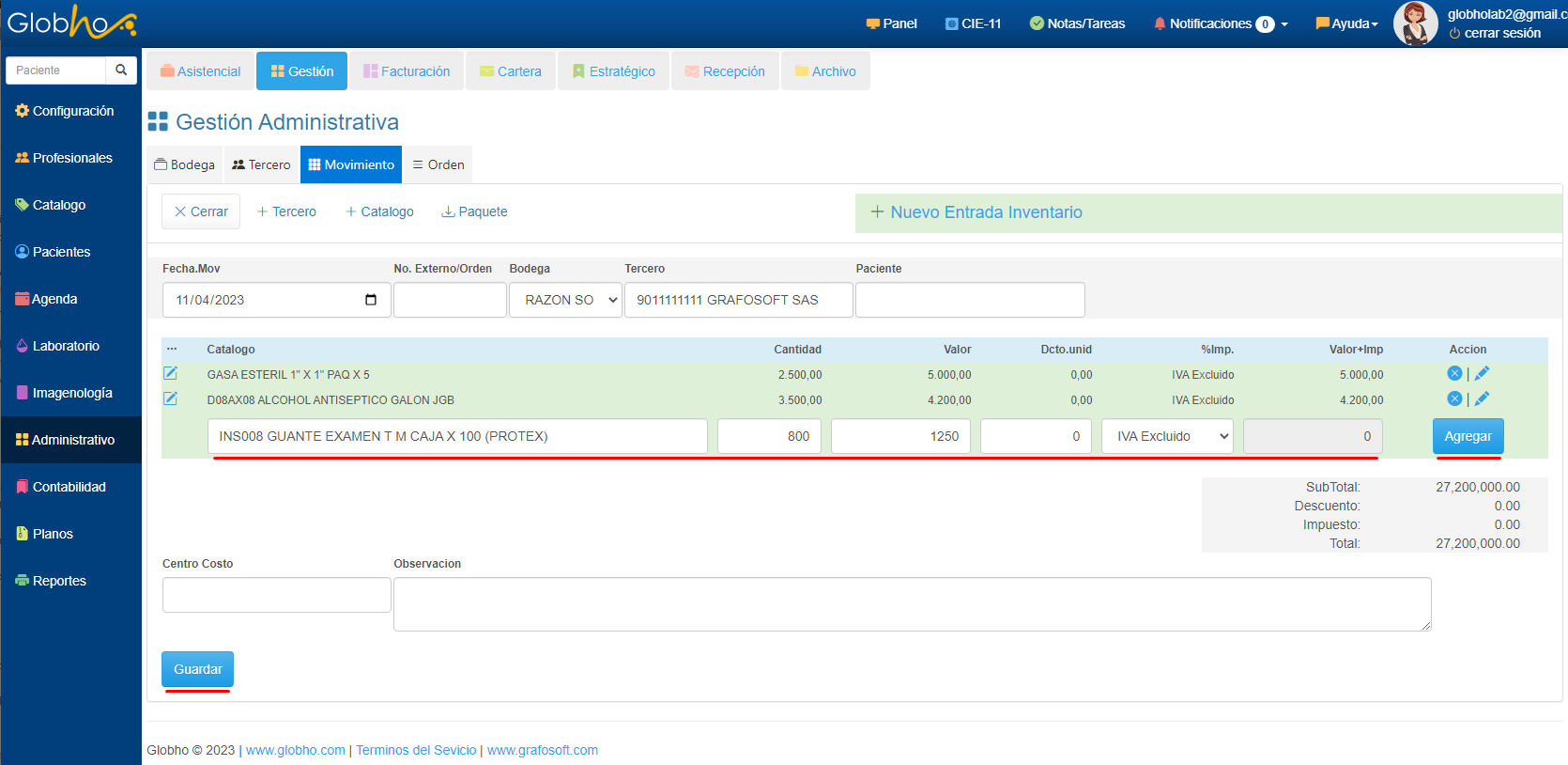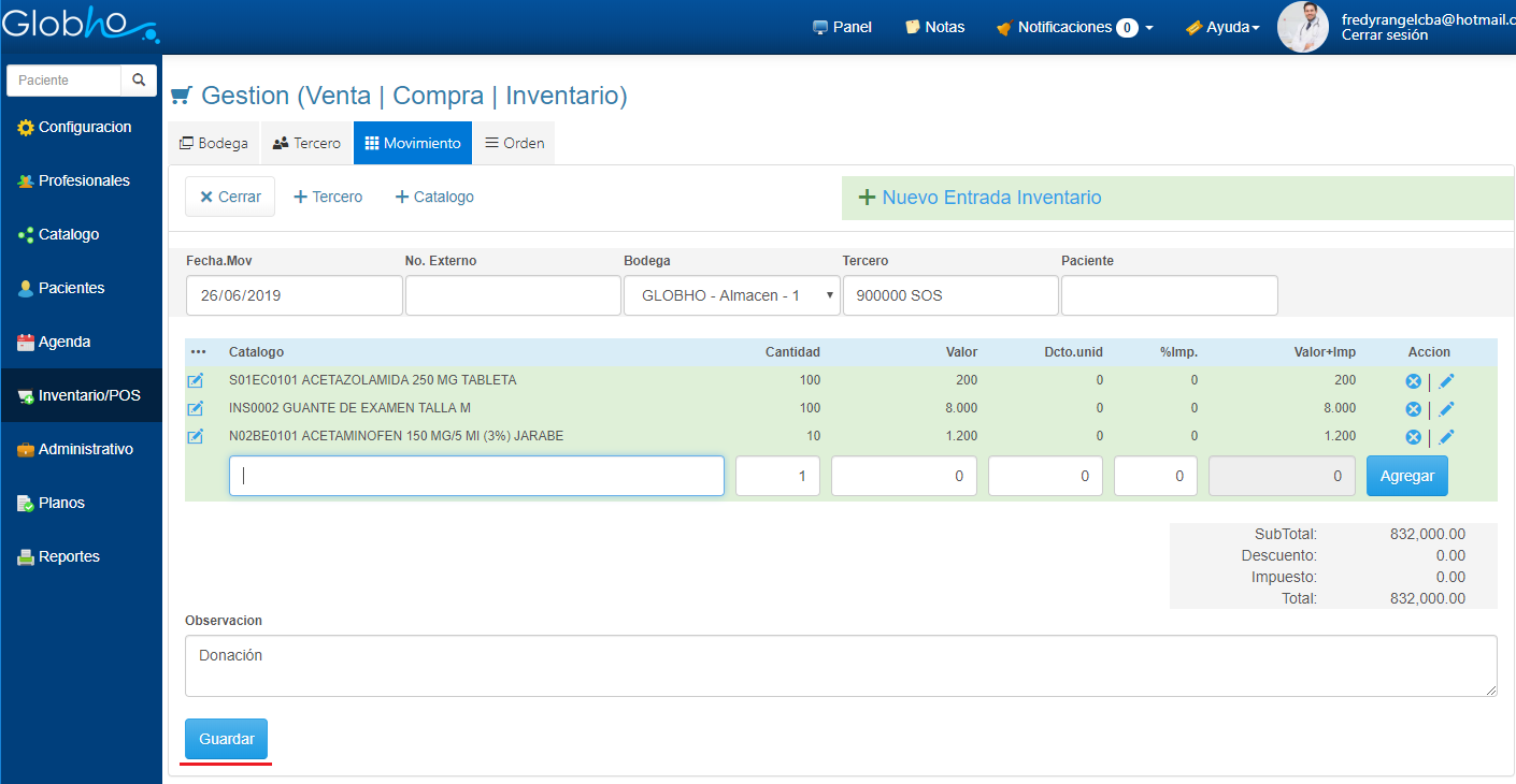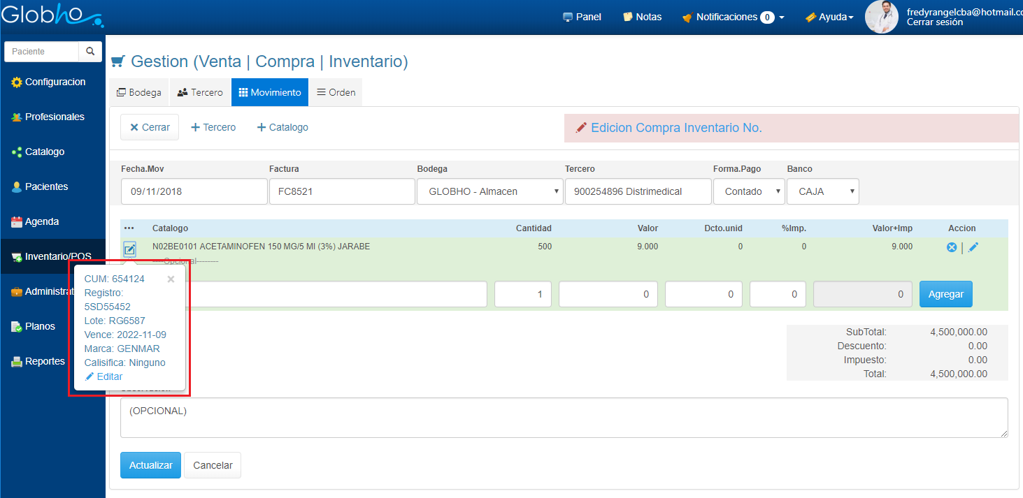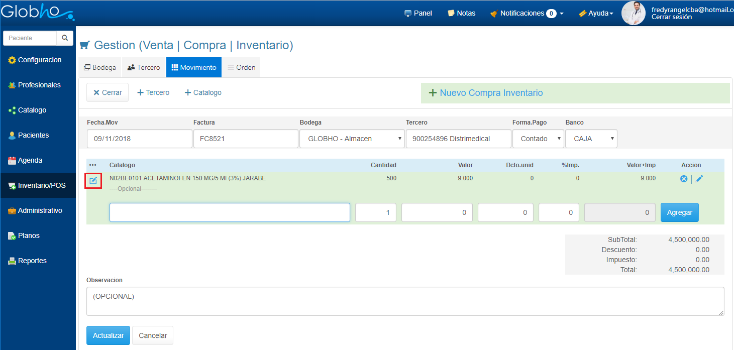✓ Los campos Cantidad y Costo, Impuesto, Registro Sanitario, Lote y Fecha de Vencimiento son campos opcionales.