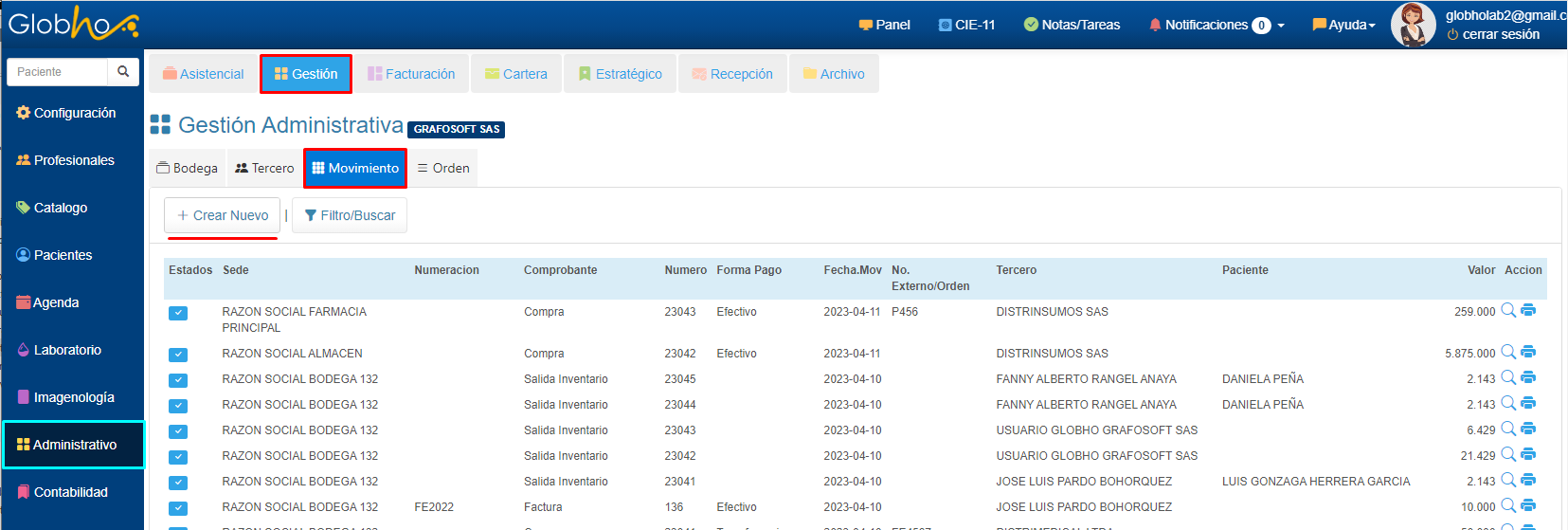 2. En la ruta Gestión - Movimiento, haz clic en el botón Crear Nuevo.