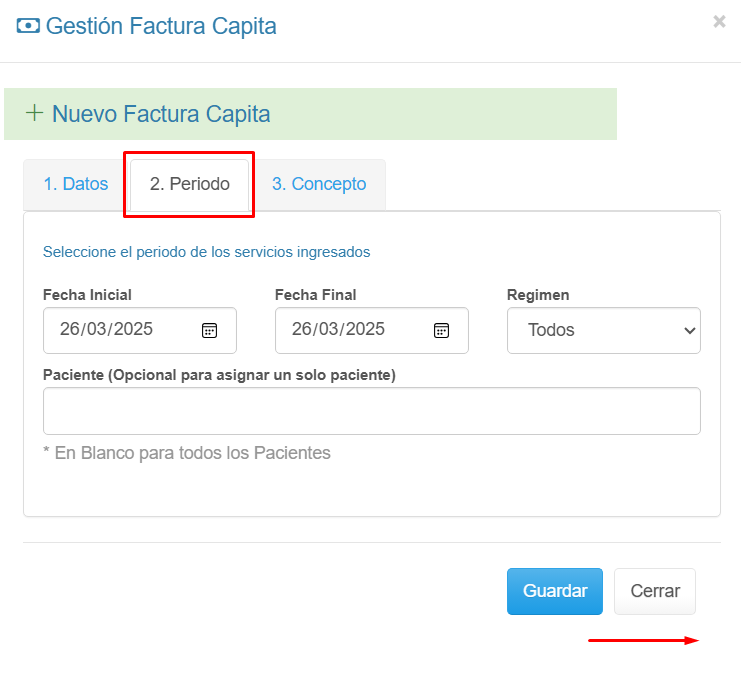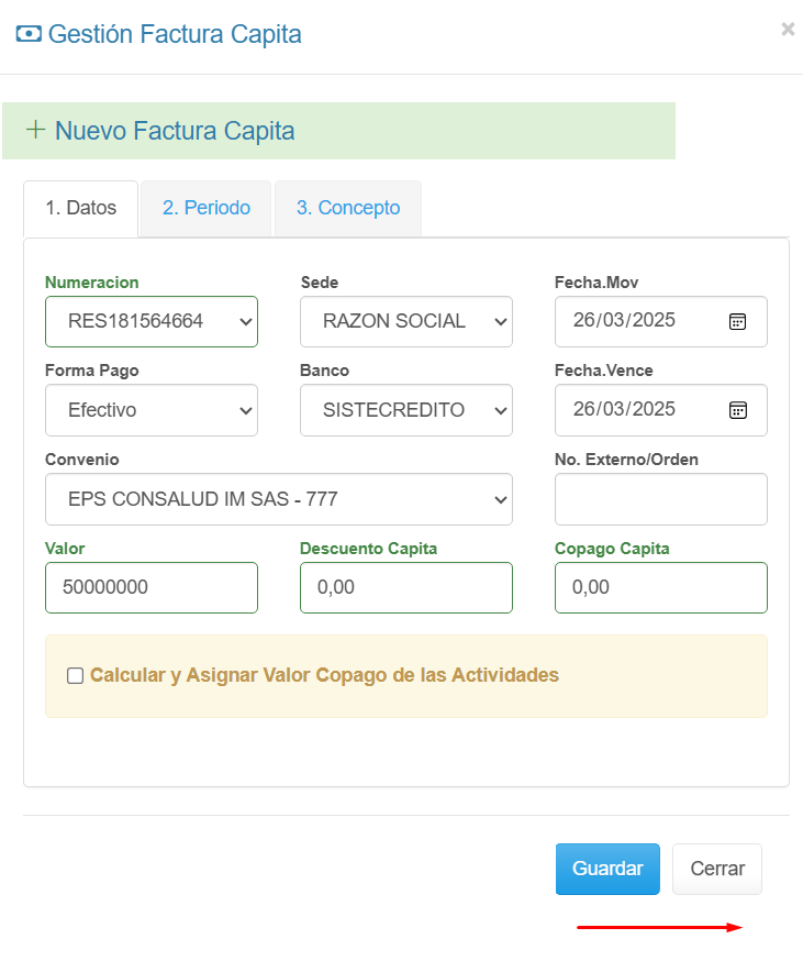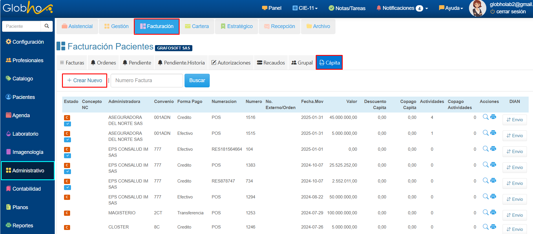 1. Debes tener previamente creada la Administradora y el Convenio Ver aquí 2. Ingresa a Menú Administrativo, selecciona la pestaña Facturación y haz clic en la opción Capita. 3. Haz clic sobre el botón Crear Nuevo.