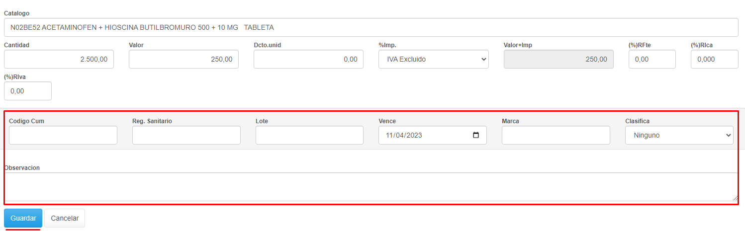 ✓ Los campos Cantidad y Costo, Impuesto, Registro Sanitario, Lote y Fecha de Vencimiento son campos opcionales.