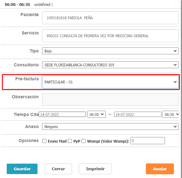 1. Ingresa a menú Agenda - Programado, selecciona el profesional a quién se asignará la cita. 2. Ubica el cursor del mouse en las coordenadas de Fecha y Hora requeridas y haz clic sostenido hasta finalizar el tiempo de duración de la cita. 3. Diligencia el formulario con los datos solicitados. Para el proceso de Carga del servicio agendado a la Prefactura del Paciente, debes agregar el convenio por el cuál se facturará el servicio.