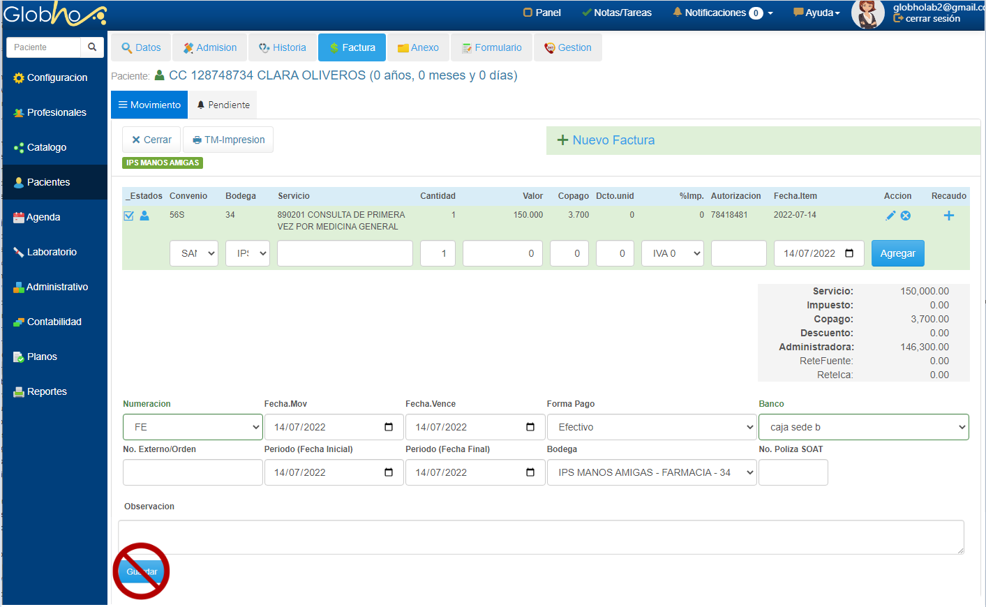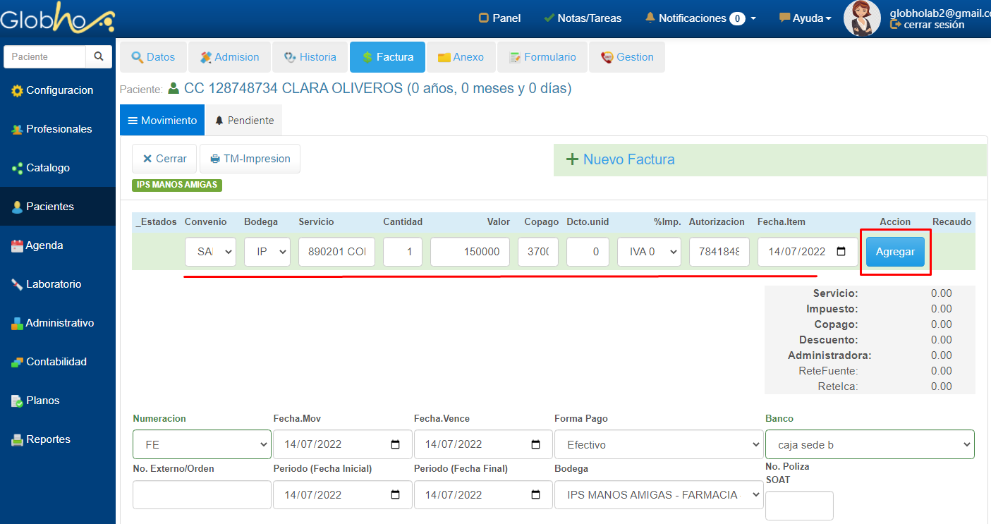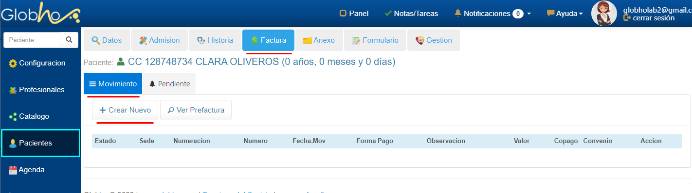 1. Selecciona el Paciente al que le vas a realizar el registro. Ver aquí 2. Ingresa a la sección Factura y en la sección Movimiento haz clic en Crear Nuevo.