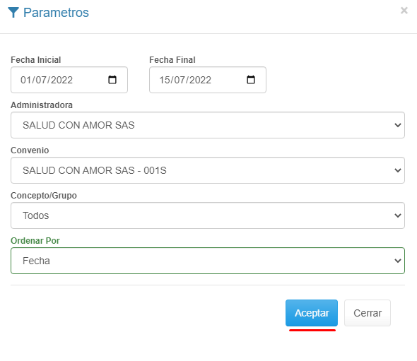 3. Ingresa los parámetros de Consulta y haz clic en el botón Aceptar.