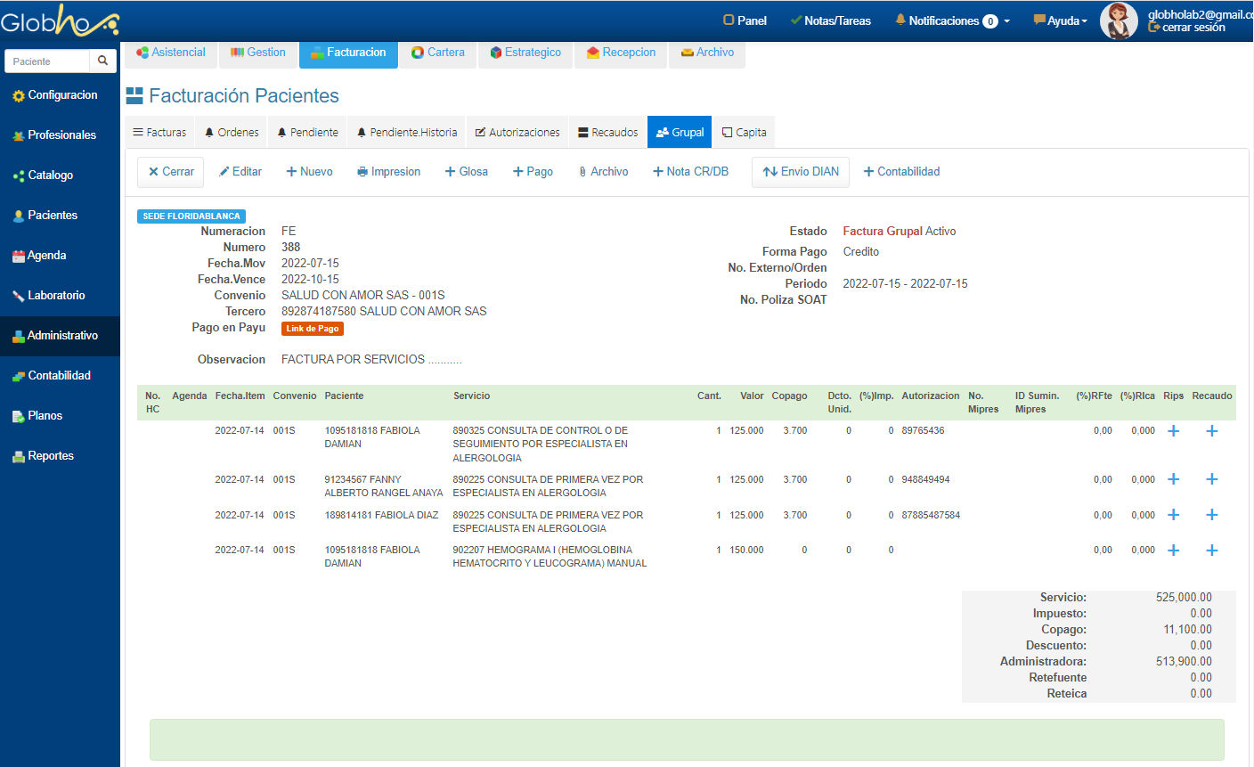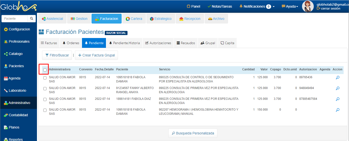 1. Realiza la ruta Menú Administrativo - Facturación - Grupal y Haz clic en el botón Lupa Ver Pendiente Factura.