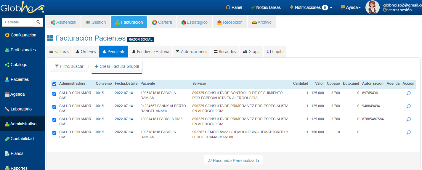 1. Agrega los servicios a las Prefacturas de los pacientes. 2. Crea la Factura Grupal filtrando los servicios agregados. |