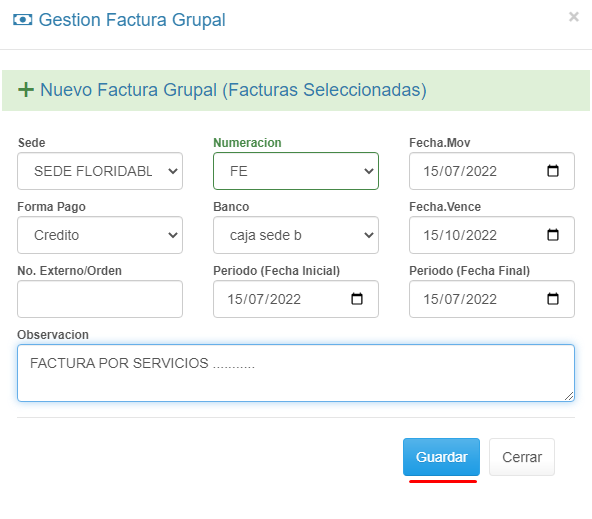 5. Haz clic en el botón + Crear Factura Grupal.
