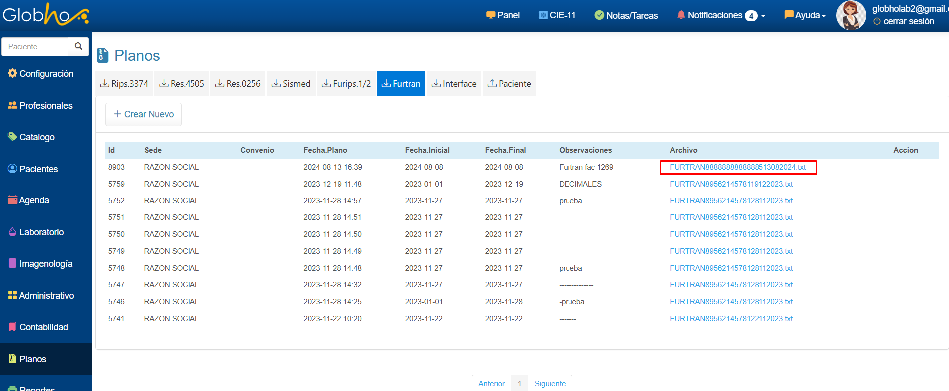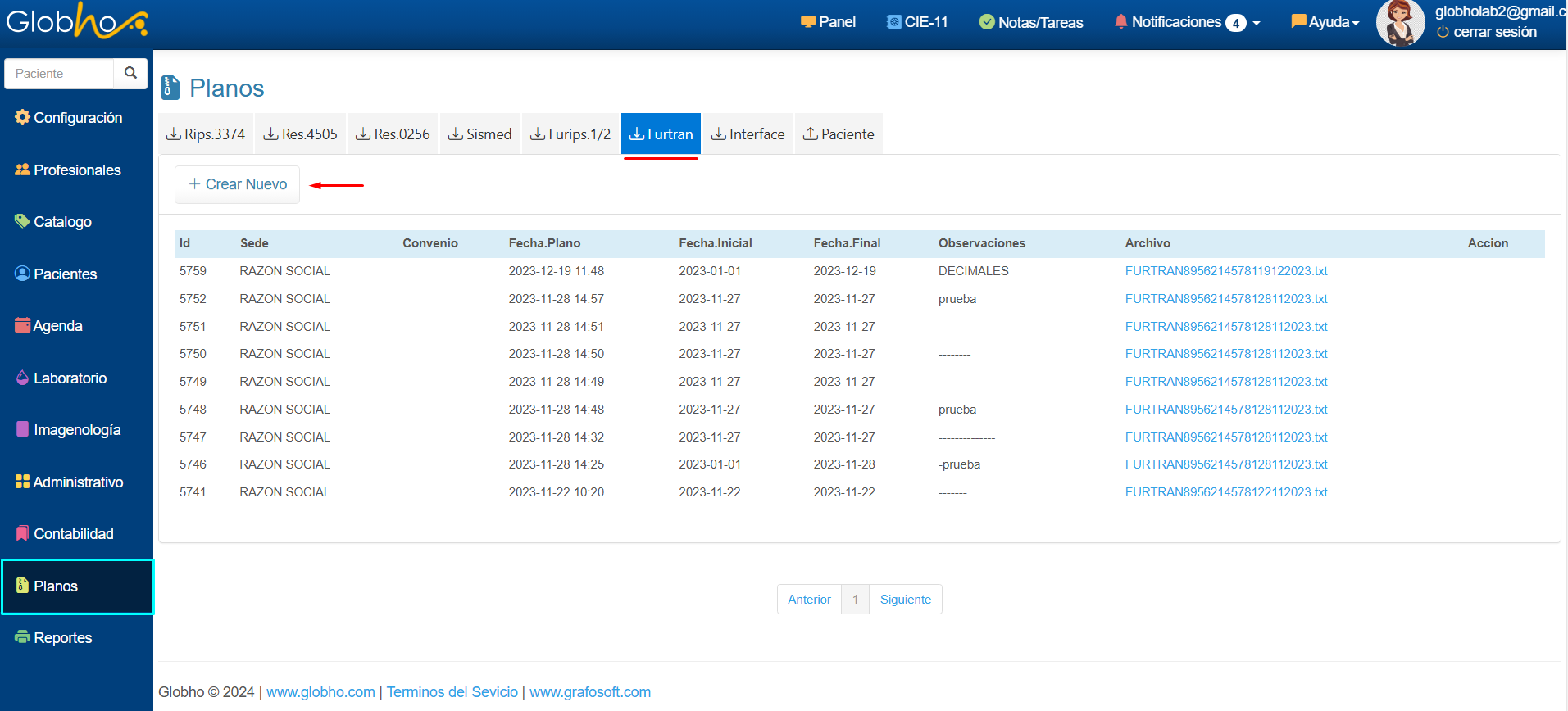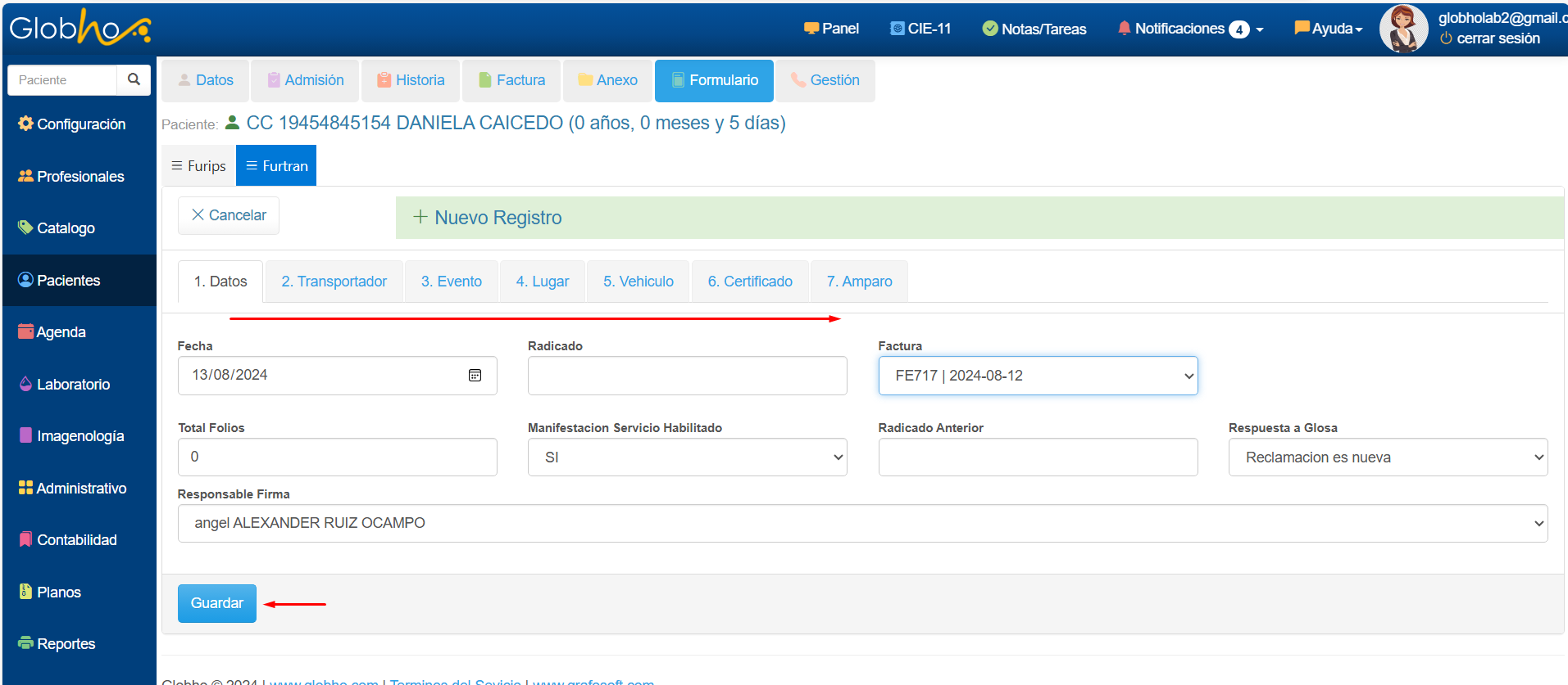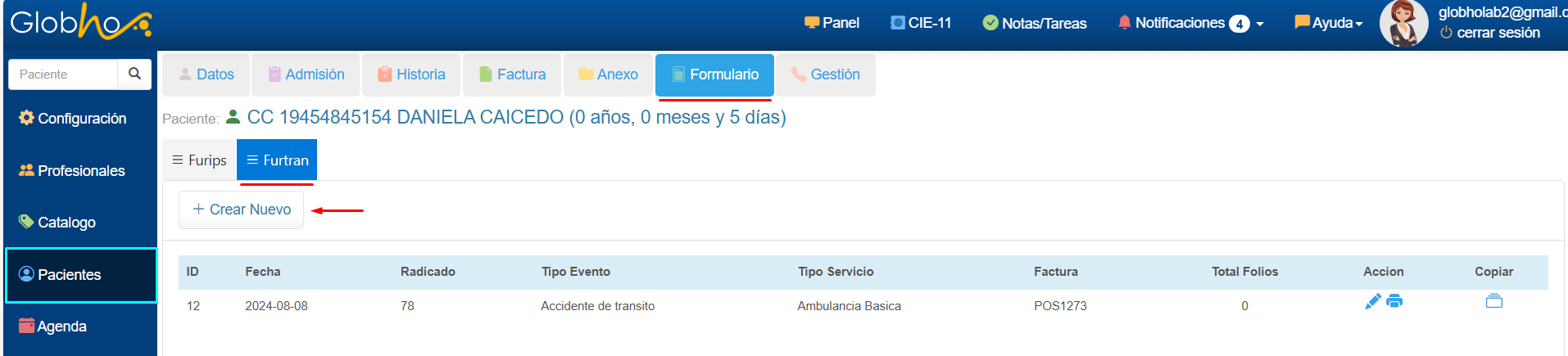 1. Ingresa a Pacientes en el Menú Principal. 2. Realiza la Búsqueda del Paciente. Ver aquí 3. Una vez en el Detalle del Perfil del Paciente, selecciona la opción Formulario, ubicate en la pestaña Furtran y haz clic el botón Crear nuevo.